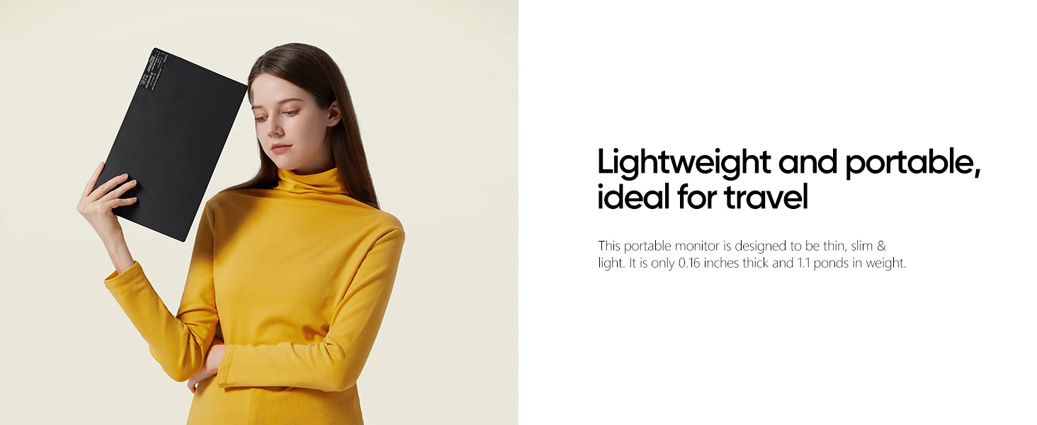 Этот портативный монитор должен быть тонким, тонким и легким. Он имеет толщину всего 0,16 дюйма и вес 1,1 пруда.