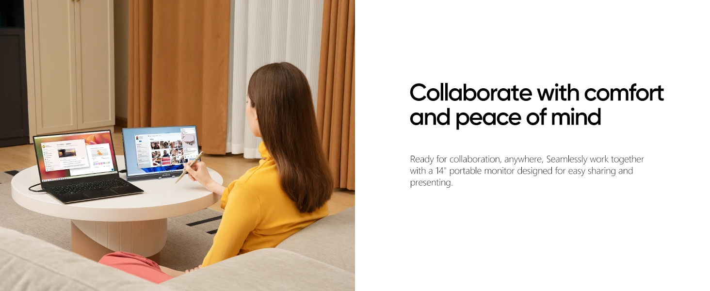 Готов к сотрудничеству в любом месте, легко работайте вместе с 14-дюймовым портативным монитором, предназначенным для удобного обмена и презентации.