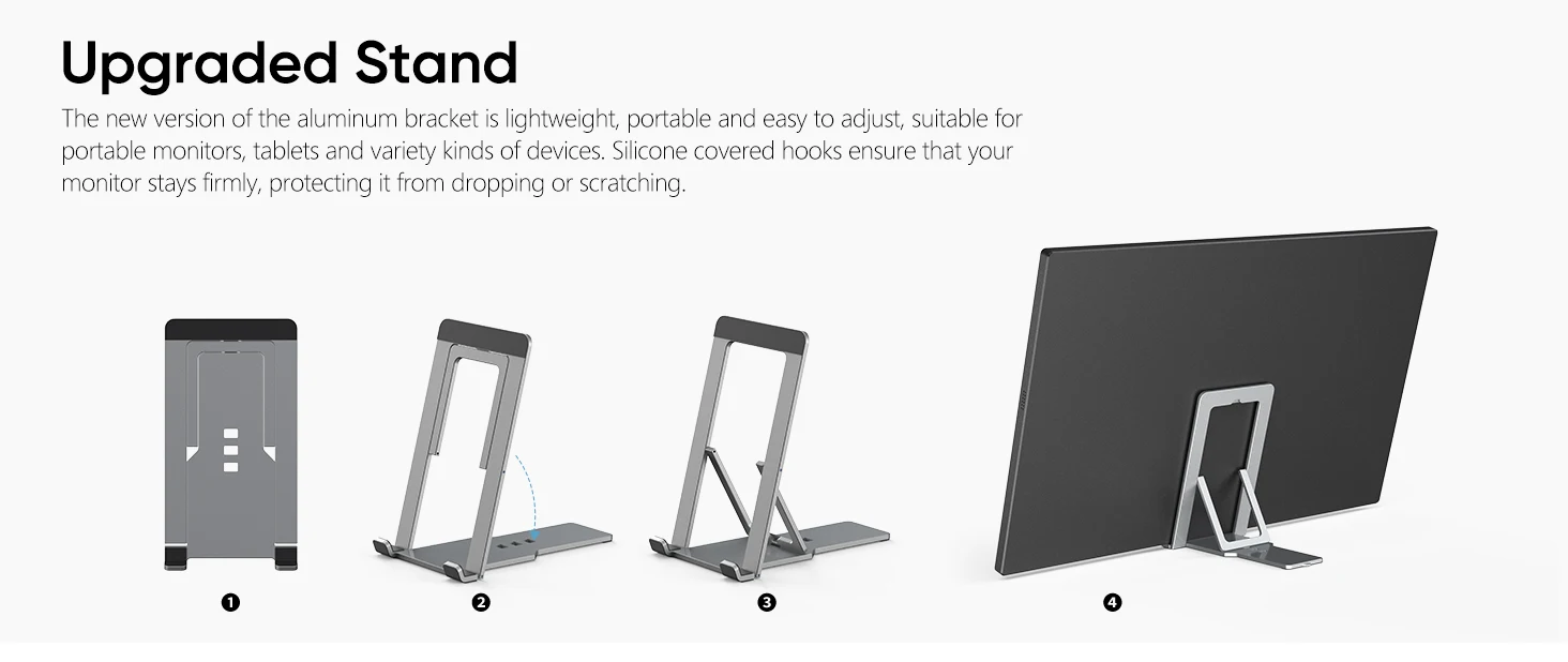 Новая версия алюминиевого кронштейна легкая, портативная и простая в настройке, подходит для портативных мониторов, планшетов и различных устройств. Крючки с силиконовым покрытием гарантируют надежное удержание монитора, защищая его от падения и царапин.