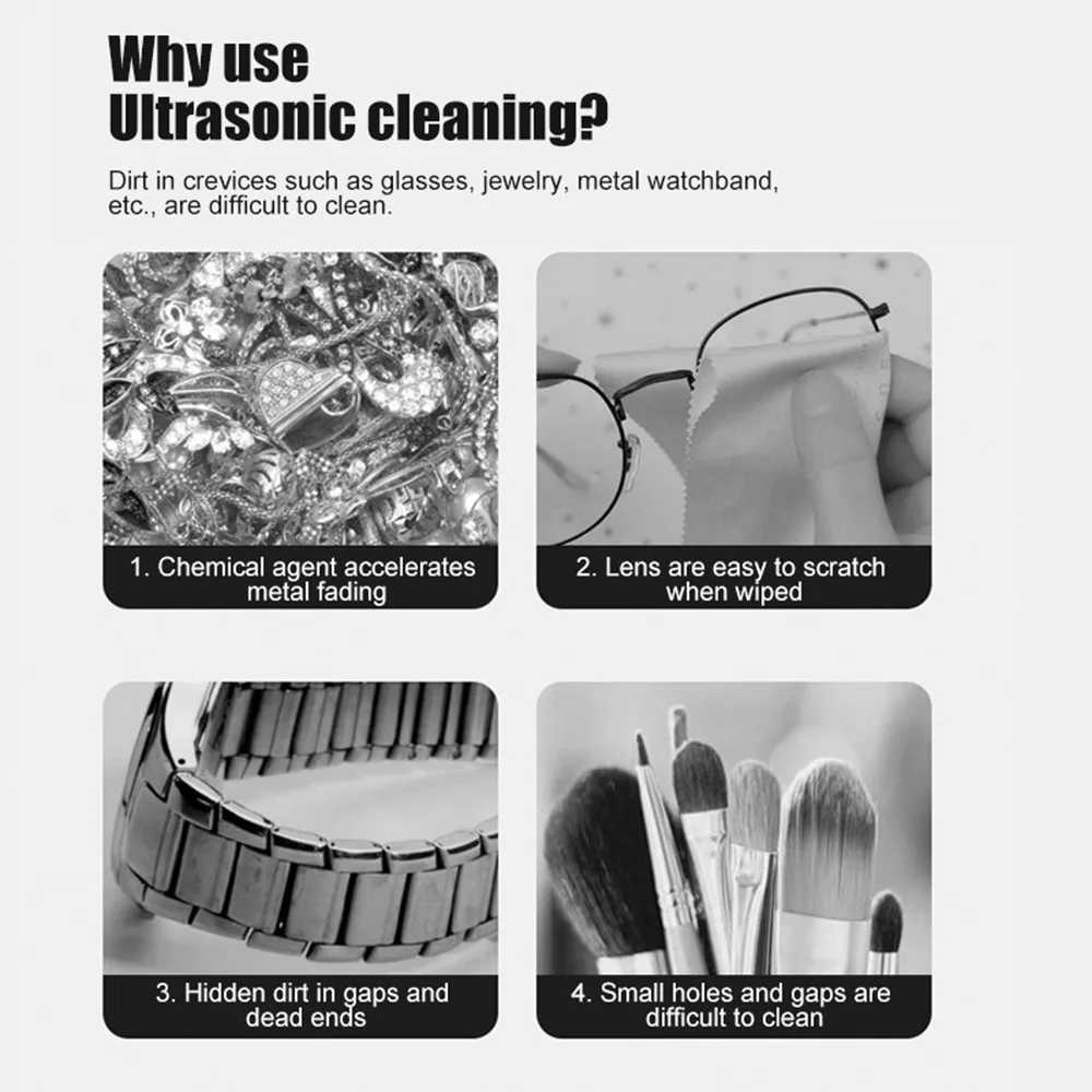 5. Расширенный метод очистки: прекратите использование традиционных жидких чистящих средств и кистей, которые могут повредить ваши ценные вещи и руки. Ультразвуковые очистители являются идеальной заменой для традиционных жидких очистителей. Делает очистку грязью проще и безопаснее, вы можете очистить свои вещи в любое время, в любом месте, и ультразвуковой не поцарапает и не повредит ваши ценные вещи.