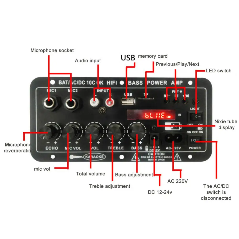 7. Двойной вход микрофона, регулируемая реверберация; Встроенный беспроводной приемник Bluetooth и fm-радио.