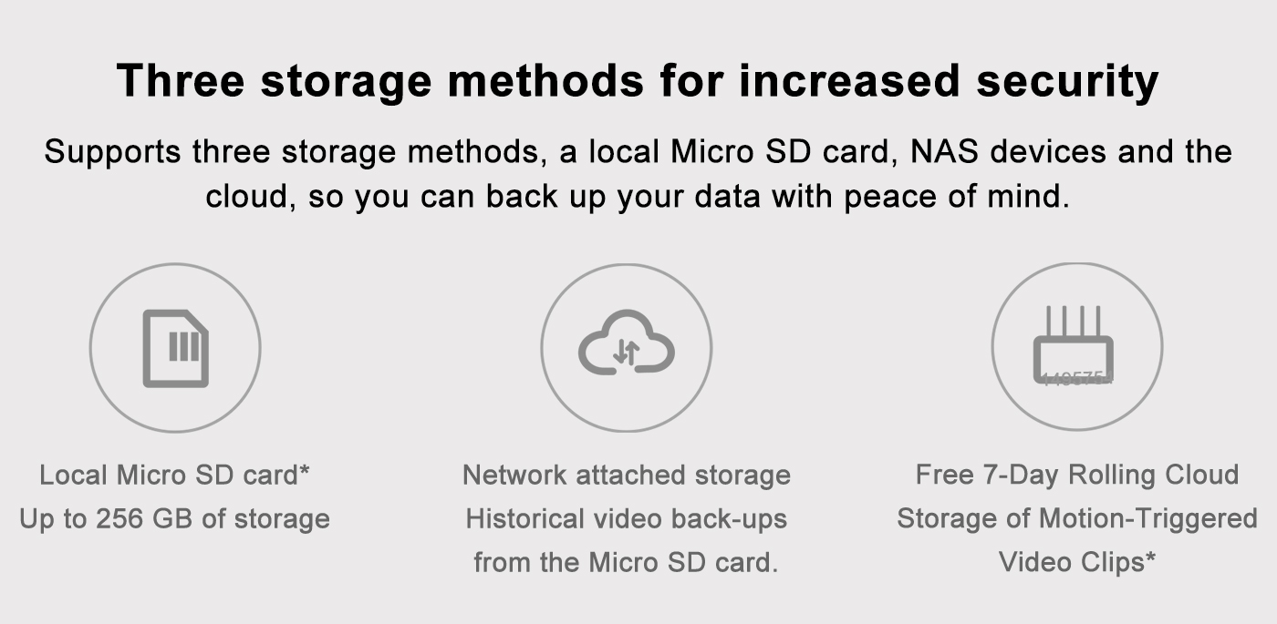 Поддерживает три способа хранения, локальную карту Micro SD, устройства NAS и облако, так что вы можете сохранять свои данные спокойно.