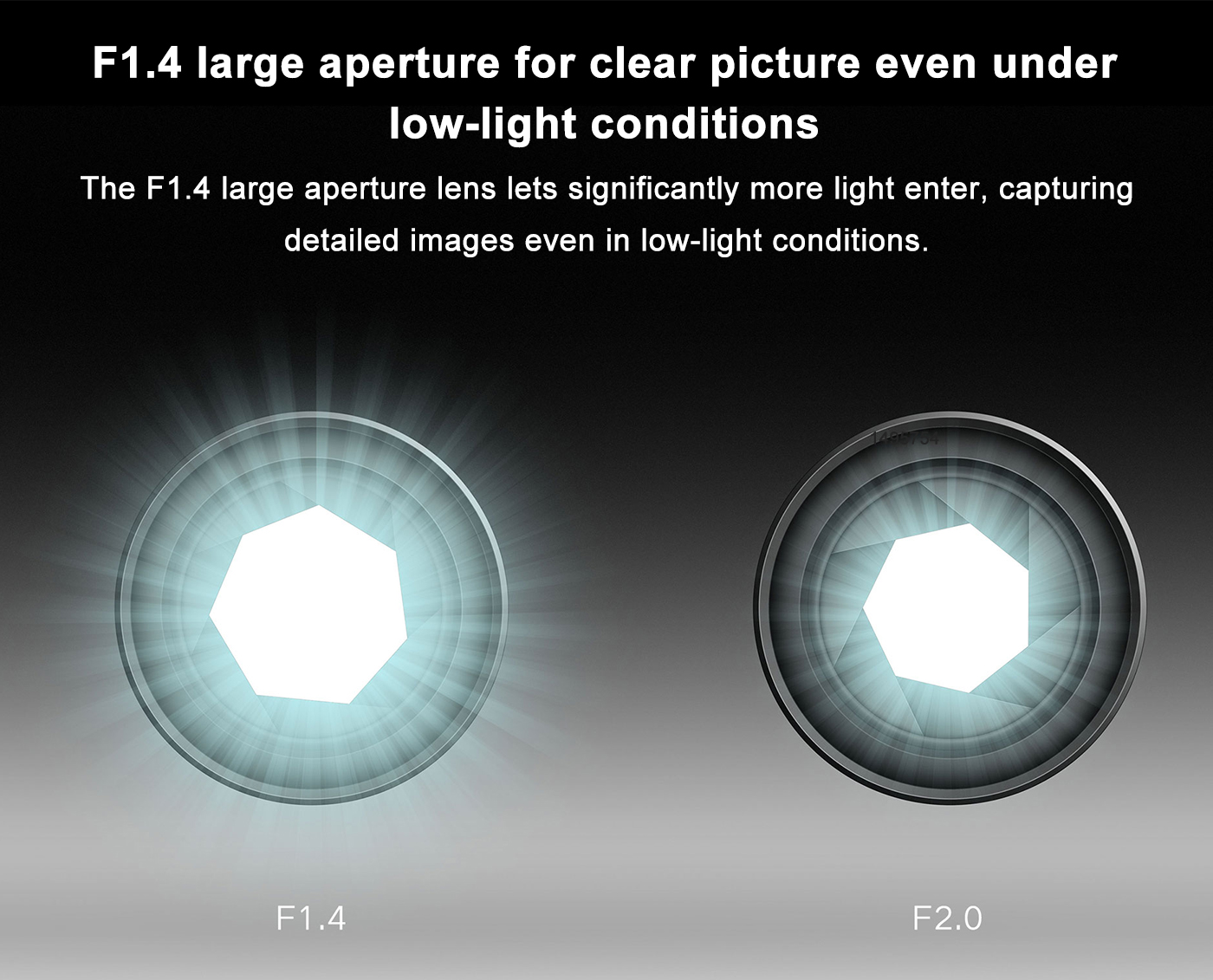 Объектив с большой апертурой F1.4 позволяет значительно больше светильник, захватывая детальные изображения даже в условиях низкой светильник.Улучшенный объектив 6P для дисплея высокого качества