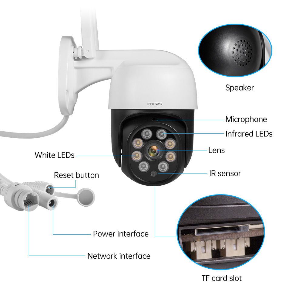 Наружная камера Fuers является водонепроницаемой (IP65) и позволяет использовать ее на открытом воздухе. Камера отлично работает как внутри, так и снаружи вашего дома, даже в суровых погодных условиях.