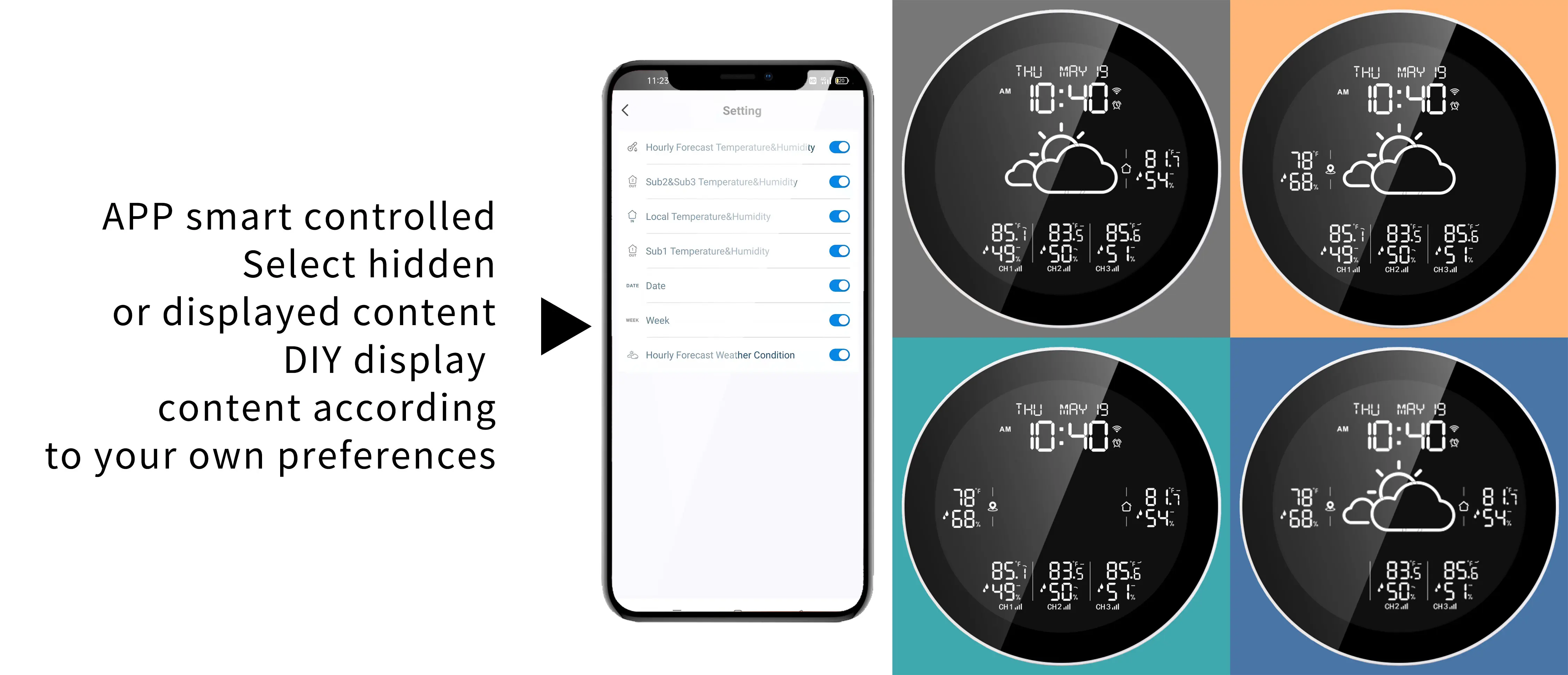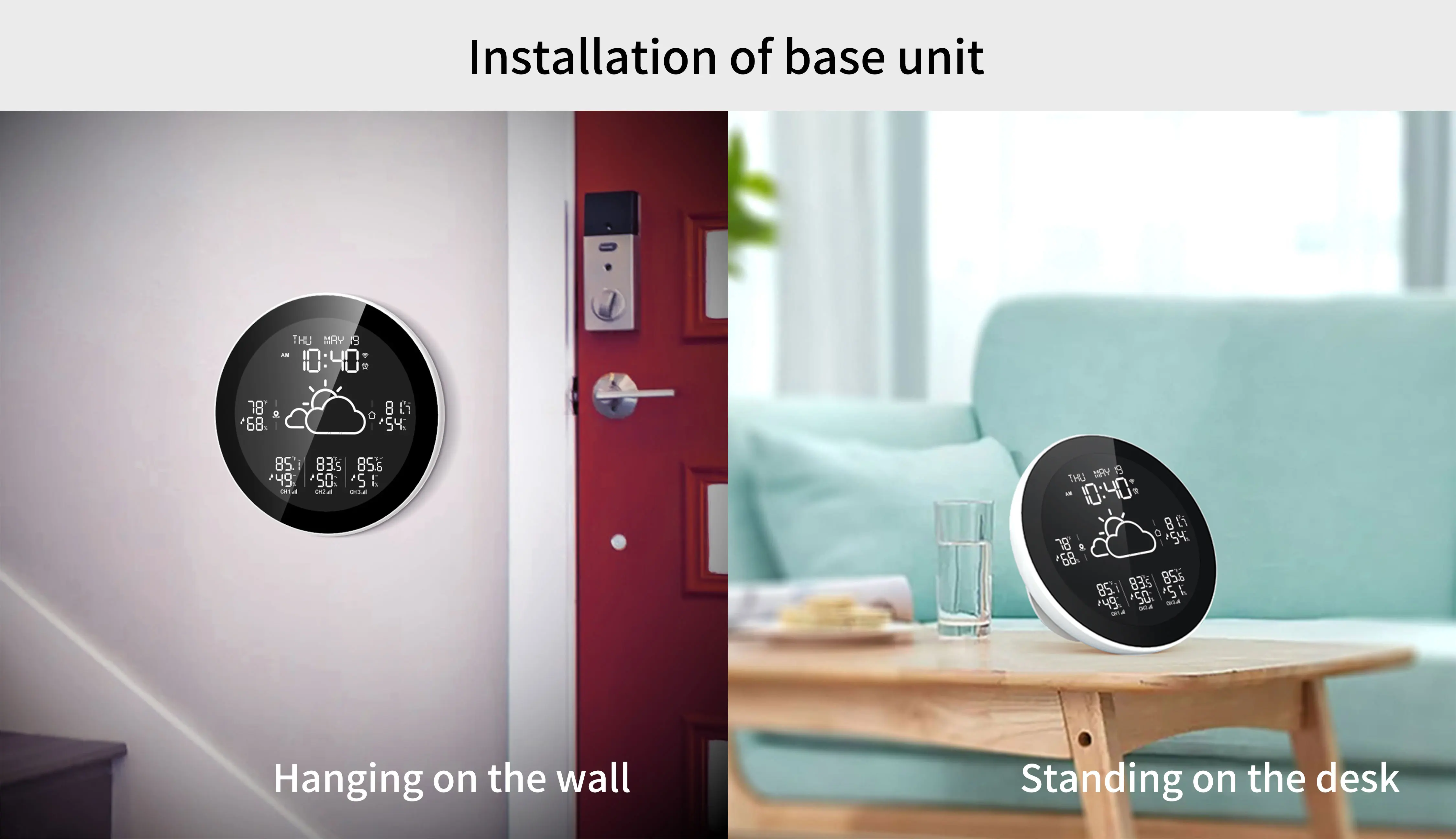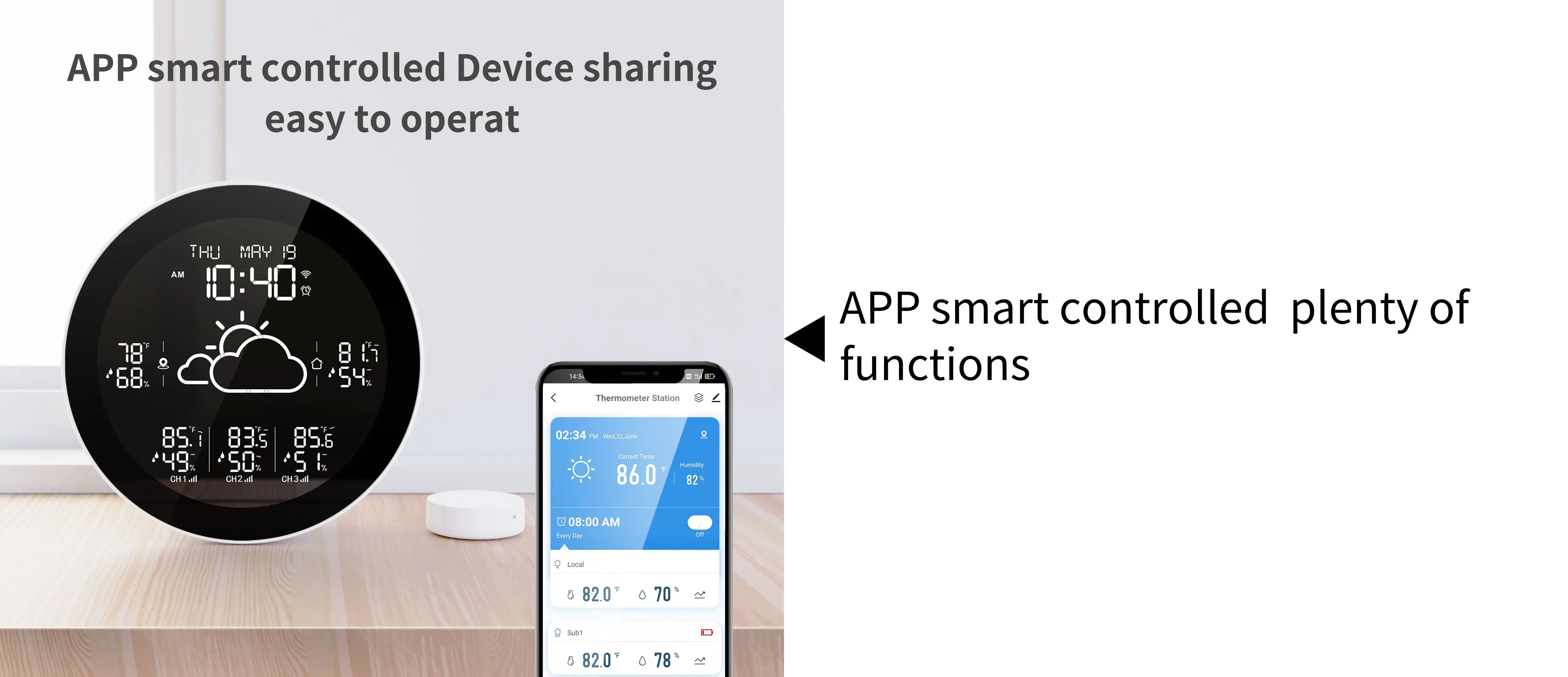 Каждая основная машина соединяет до трех вспомогательных машин. Установите вспомогательную машину крытую или на открытом воздухе, собранные данные будут переданы и будут показаны к главной машине крытой. Вы также можете настроить и управлять им с помощью телефона, а также проверять данные о погоде, данные истории температуры в помещении/на улице из приложения или основной машины в помещении.