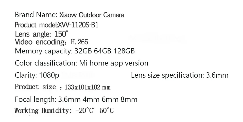 Характеристики: модель изделия: XVV-1120S-B1 разрешение: 1080 P Объем памяти: 32 ГБ 64 Гб 128 ГБ увеличение изображения: 3D Math поле снижения уровня шума Угол обзора: 150 ° Голосовая система: функция двустороннего голосового хранения: карта Micro SD Рабочая температура:-10 °C ~ 50 °C Входная мощность: DC-12V/1A (хост) 100-240 В ~ 50-60 Гц 0.7A (адаптер) Спецификация объектива: F2.4 2,4 мм ночник с диафрагмой: 4 инфракрасных света способ подключения: Wi-Fi 802,11 b/g/n 2,4 ГГц Поддержка платформы: Android 4,1/ios 8,0 и выше Рабочая влажность: ≦ 90% (40 ° C комнатной температуры окружающей среды)