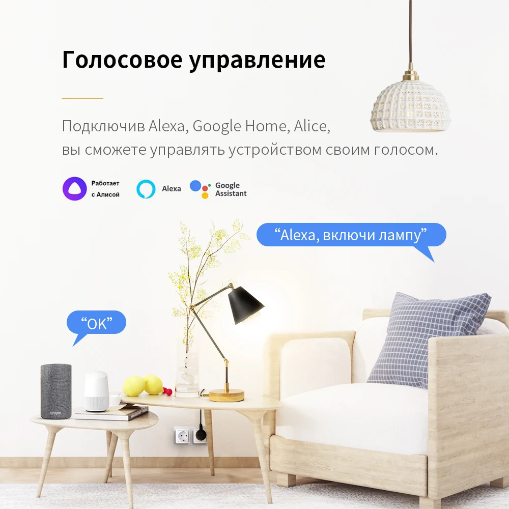Умные Вилки можно использовать с устройствами, поддерживаемыми Alexa и Google Assistant для легкого голосового управления.