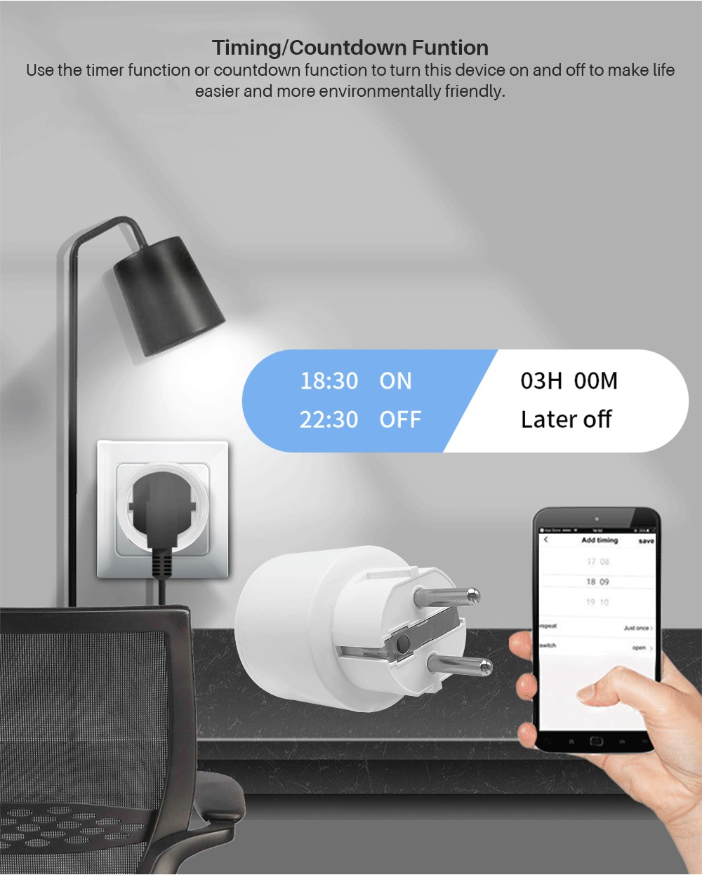 Используйте функцию таймера или функцию обратного отсчета, чтобы включать и выключать это устройство, чтобы сделать жизнь проще и экологичнее.