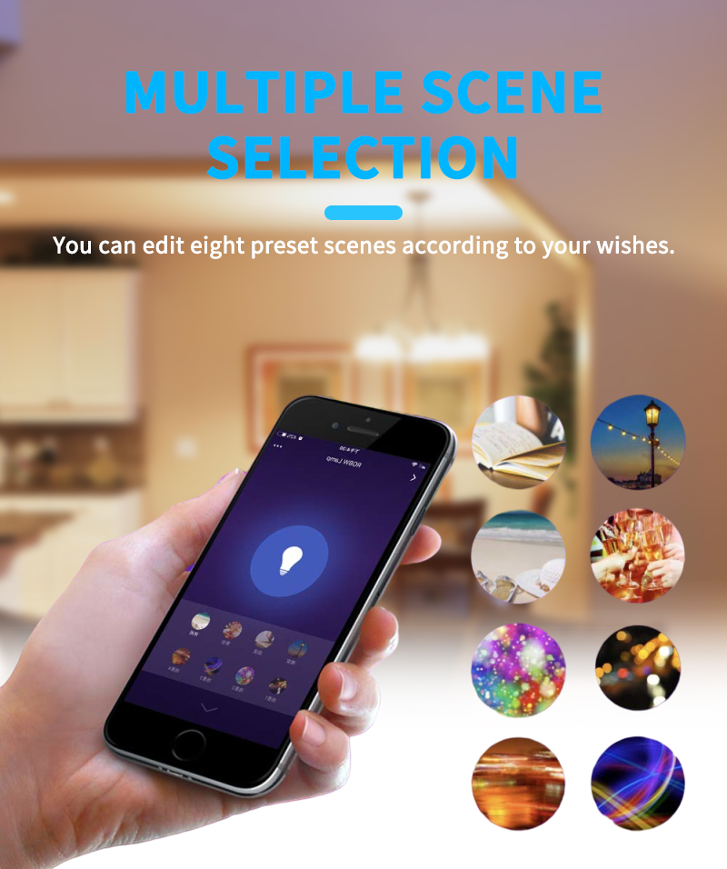 【Сцена и синхронизация музыки 】сцена приложения по умолчанию изменяется, вы также можете изменить свою собственную сцену и настроить изменение цвета. Синхронизация музыки, вы можете открыть музыкальное приложение на своем мобильный телефон, а Приложение smart life автоматически фиксирует изменения ритма, чтобы реализовать изменения ритма светильник и музыки.