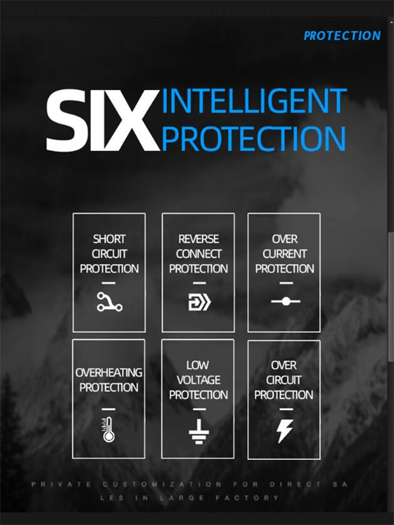 Пятикратная функция защиты: «Обратное подключение цепи, короткое замыкание, низкий уровень Напряжение , Перегрев, Перегрузка по току"