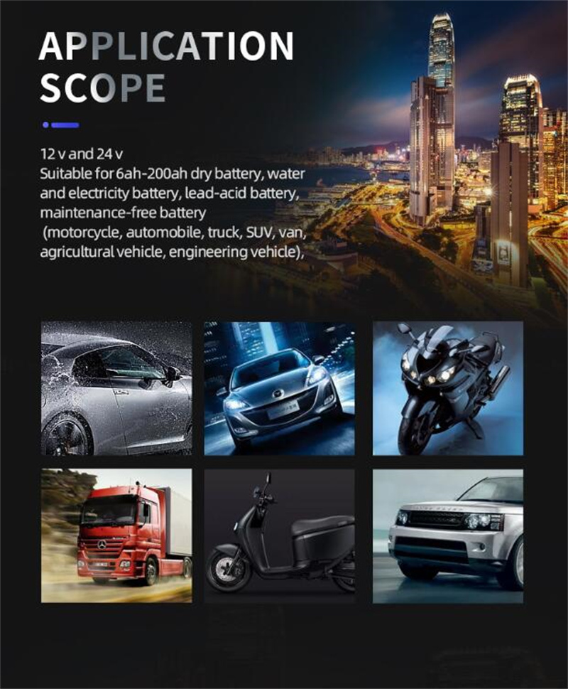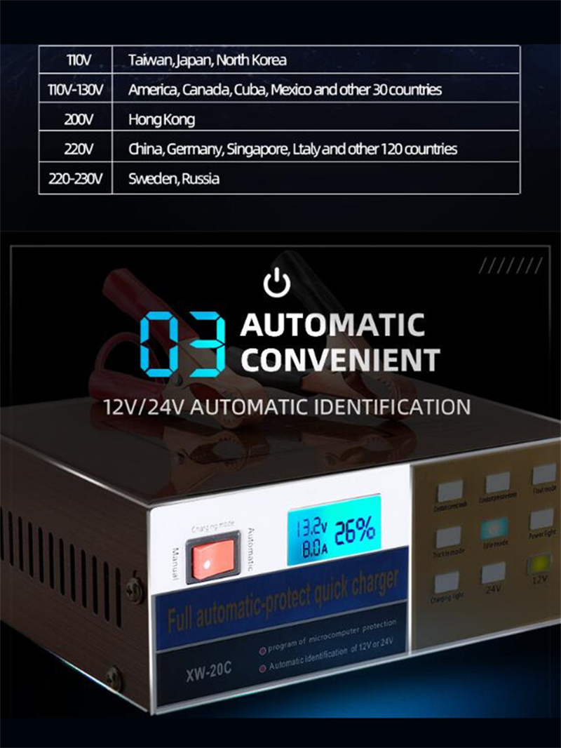 Используйте для аккумуляторной батареи емкостью 6-100 Ач (более 100 Ач, рекомендуется использовать наши зарядные устройства более высокой мощности, такие как: XW-30S, XW-40S, MF-4)