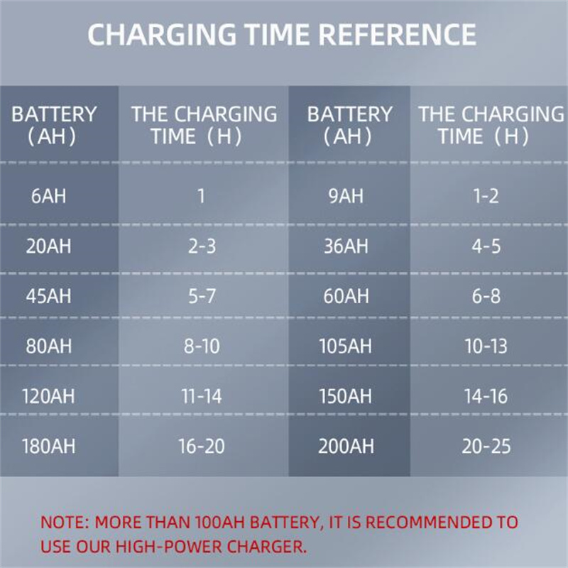Для аккумуляторных батарей менее 100 Ач или больше время режима зарядки постоянным током будет немного больше на начальном этапе, процент отображения зарядного устройства будет отложен, дождитесь режима постоянного напряжения, режим непрерывной зарядки будет сокращен, Процент заряда зарядного устройства в это время Дисплей ускорится и не повлияет на эффект зарядки.
