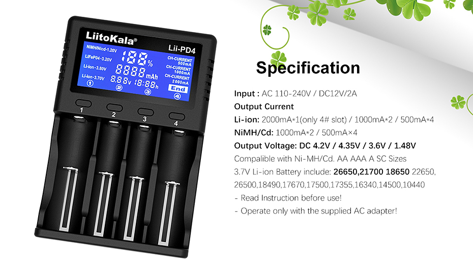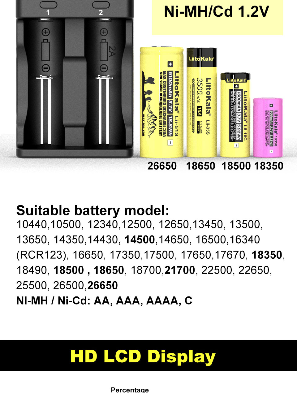 Li-ion / IMR/LiFePO4: 26650,21700,20700, 18650, 18490, 18350, 17670, 17500, 16340(RCR123), 14500, 10440