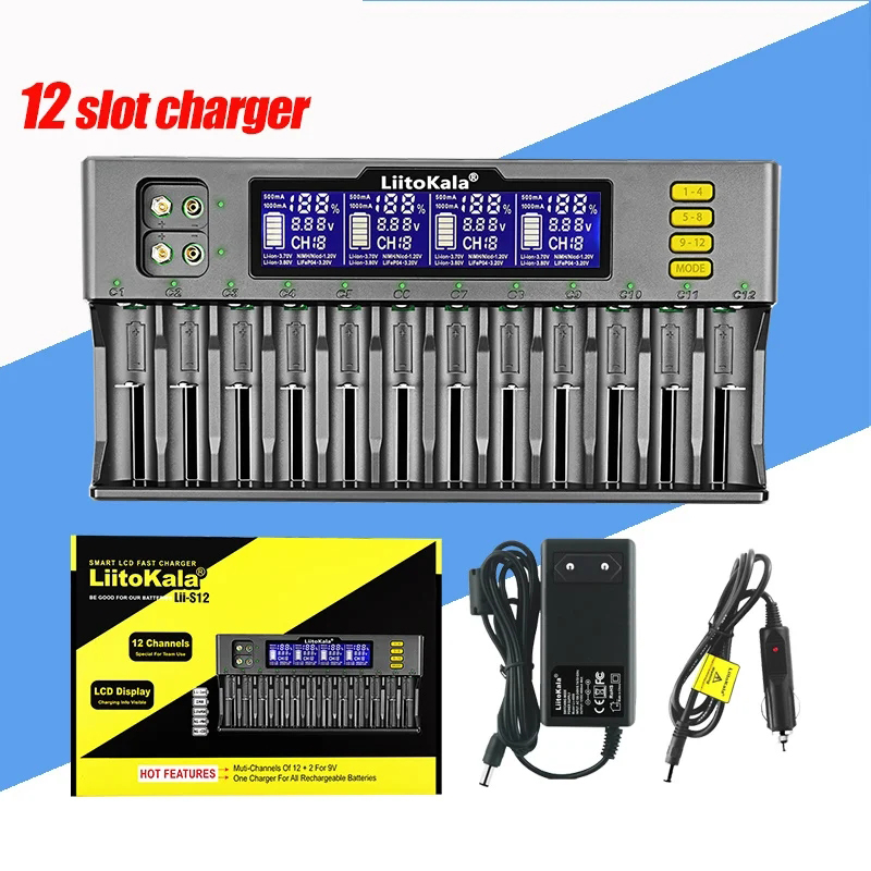 Умное зарядное устройство LiitoKala с ЖК-дисплеем и 12 слотами для Li-Ion LiFePO4 Ni-MH Ni-Cd аккумуляторов 9 в 21700 20700 26650 18650 16340 RCR123 18350 18490 14500