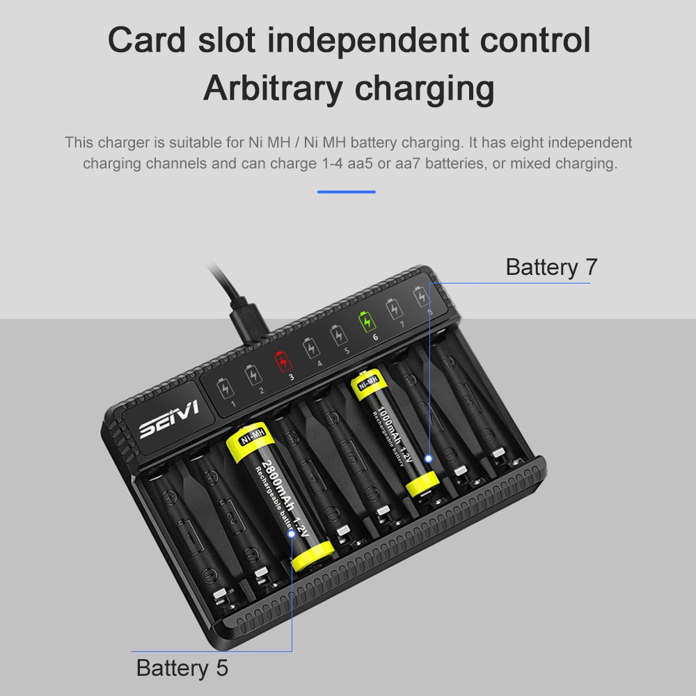5. Он может быть подключен к 1-8 батареям aa или aaa никель-металл-гидрид, технологии управления микрокомпьютером и разумно реализовать 8 независимых зарядных слотов.