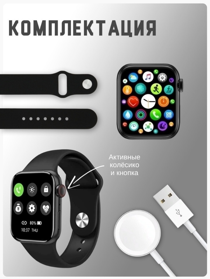 Смарт часы, ремешок, беспроводная зярядка, инструкция, коробка.