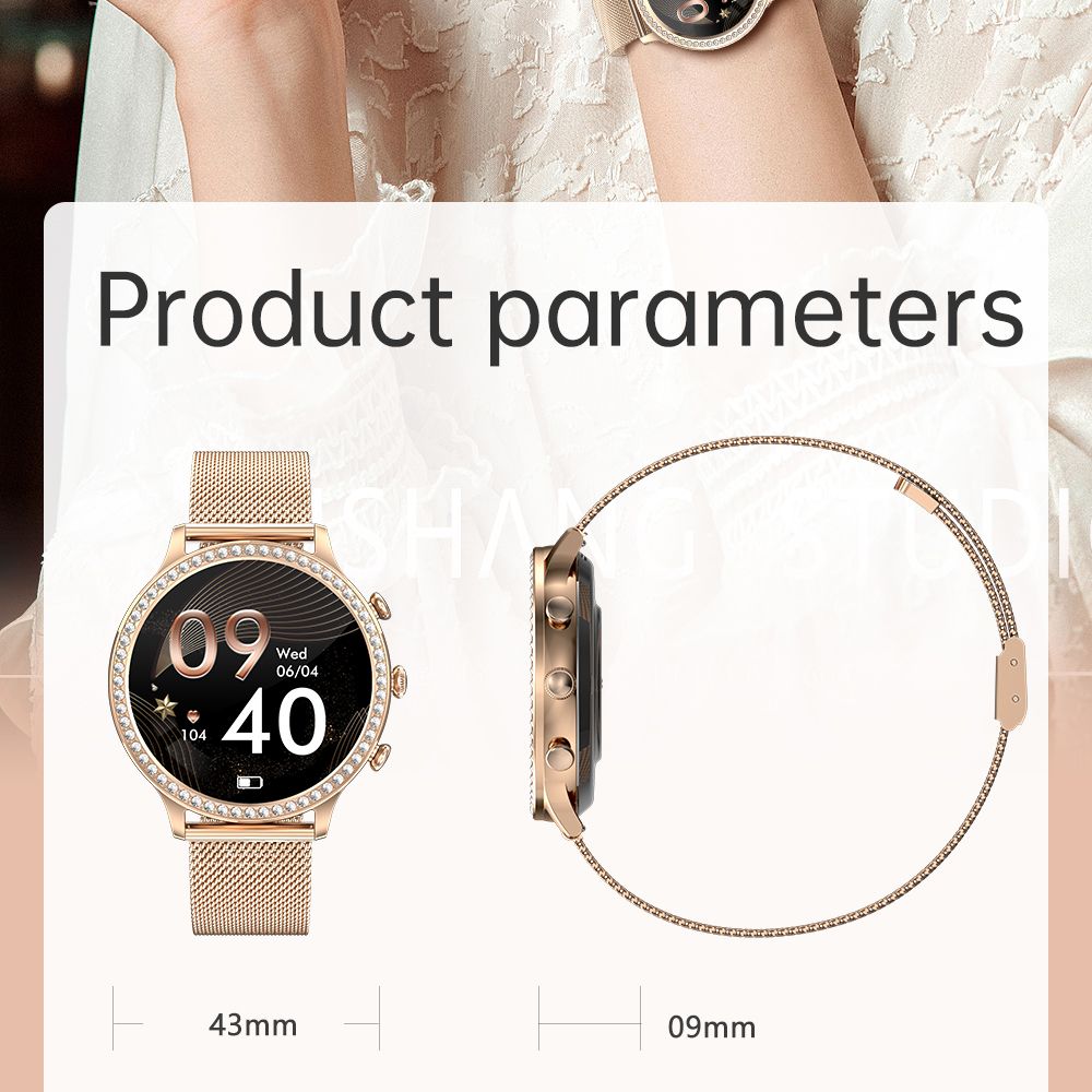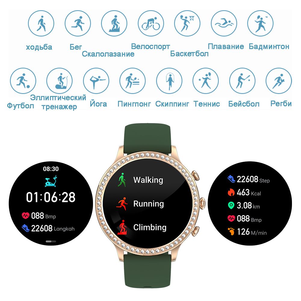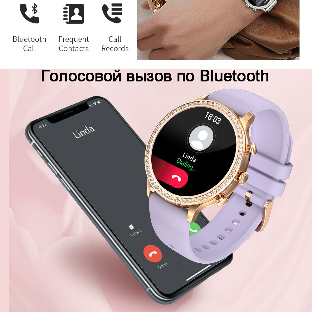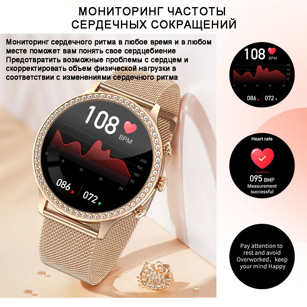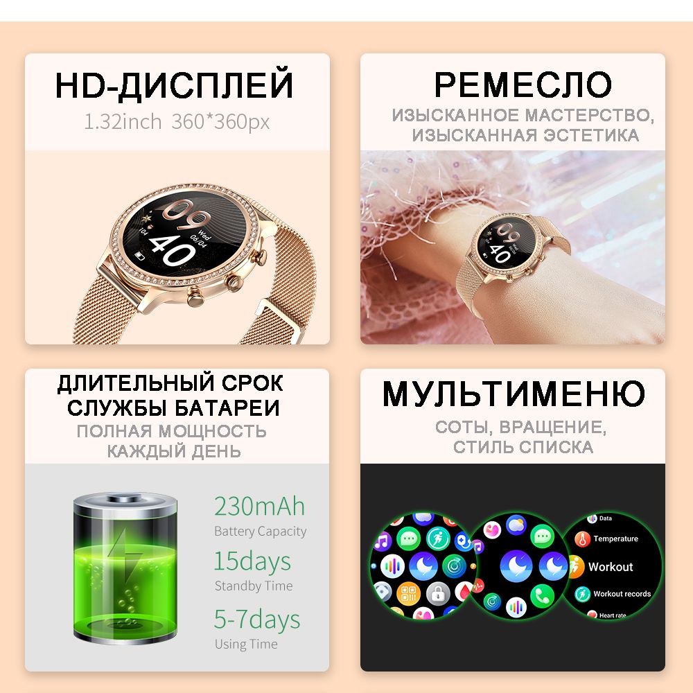 Описание: Женские наручные часы Smart Watch - функциональное и стильное решение для тех, кто хочет совместить фитнес-трекер и изящный аксессуар в одном товаре. Умный браслет имеет множество функций: он уведомит вас о входящих звонках и смс с помощью вибрации, измерит давление, пульс и шаги, покажет время, дату, погоду и многое другое. Электронные смарт часы водонепроницаемые - с ними можно принимать душ или плавать (глубина погружения не должна превышать 1 метр, а время нахождения под водой - 30 минут). Умные часы с браслетом серебро совместимы со всеми моделями смартфонов на платформе Android и iOS, а время автономной работы составляет до 5 дней. Серебряные часы идут в комплекте с фиксатором для зарядки, устройством для съема звеньев браслета и инструкцией. Смарт браслет станет прекрасным подарком для любимой женщины, мамы, сестры или подруги на день рождения, 8 марта, 14 февраля или без повода. Элегантный аксессуар впишется в любой образ и приведет в полный восторг его обладательницу! Технические характеристики: Дисплей: 1.32-дюймовый цветной ЖК-экран высокой четкости Разрешение: 360*360 пикселей Процессор: RTL8762DT+желе Сенсорный экран: полное касание Циферблат: ударопрочное закаленное стекло Емкость аккумулятора: 230 мАч Версия Bluetooth: BT5.0 Класс водонепроницаемости: IP67 водонепроницаемый Частота сердечных сокращений: поддержка Шагомер: поддержка Музыкальный плеер: поддержка Вызов по Bluetooth: поддержка Регистрация вызовов: поддержка Контакты: Поддержка Набор номера телефона: Поддержка Напоминание о сидячем образе жизни (APP): поддержка Мониторинг сна :Поддержка Удаленная фотосъемка:Поддержка Прогноз погоды: поддержка Вибратор: поддержка Динамик: поддержка Датчик ускорения: Silan Micro SC7A20 Частота сердечных сокращений: SkyEase 3600+ Dynamic Heart Rate Кровяное давление: ДА, с помощью программного обеспечения Кислород: нет/нет Руководство/Язык: английский, русский Вес смарт-часов (г): 50 г Размер смарт-часов (мм): 260*43*9 мм (общая длина ремешка*диаметр корпуса*толщина) Совместимая платформа: поддержка IOS 9.0+ и Android 4.4+ особенность: мультиспорт ● Свободно переключайте спортивный режим, получайте удовольствие от спорта и развивайте хорошую фигуру. функция напоминания ● Поддержка будильника, сидячий образ жизни, входящие вызовы, текстовые сообщения (сообщение, QQ, Wechat, Skype, Facebook, Twitter, Line, Whatsapp). Ваши часы предупредят вас вибрацией. Другие функции: ● Монитор артериального давления, монитор сердечного ритма, спящий режим, время, удаленная камера, шагомер, напоминание о вибрации, будильник, секундомер