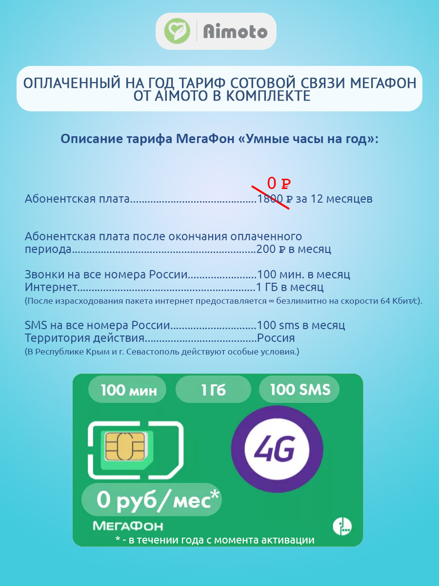 Предоплачен 1 год абонентской платы!Оплаченный на год тариф сотовой связи от МегаФон в комплекте!Тариф «Умные часы на год»: