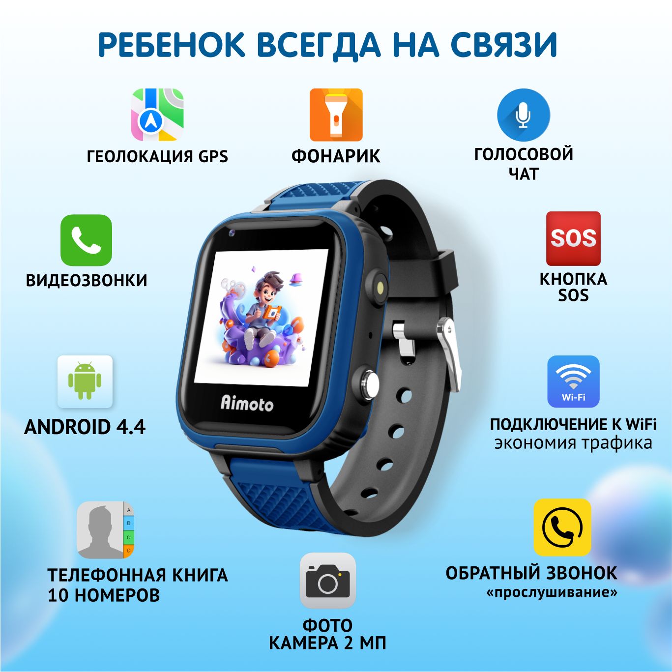 • Aimoto TelegramУмные детские часы помогут родителям всегда быть на связи с детьми и знать, что с ними все в порядке. Детям гаджет предоставит множество возможностей для общения, обучения и развлечений.