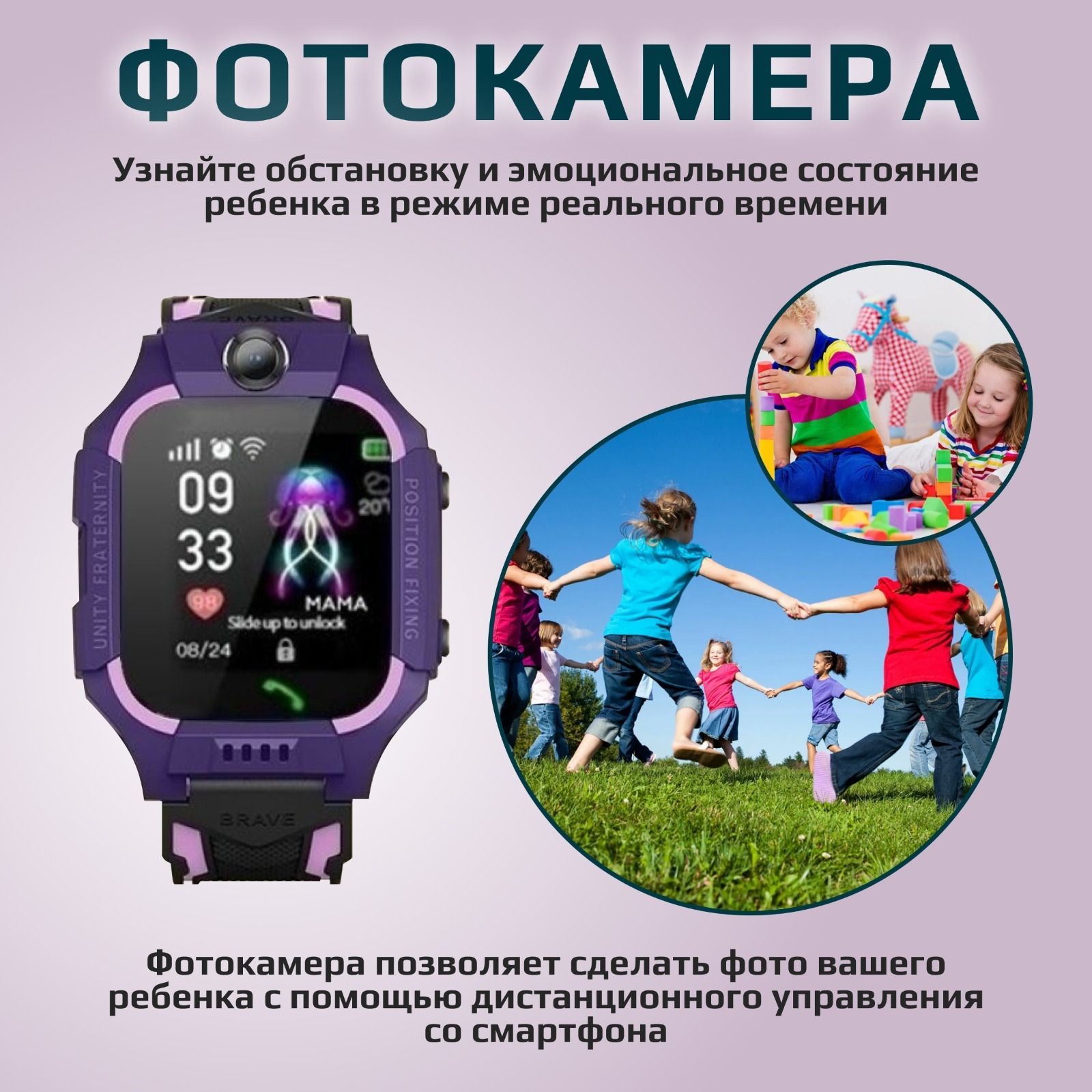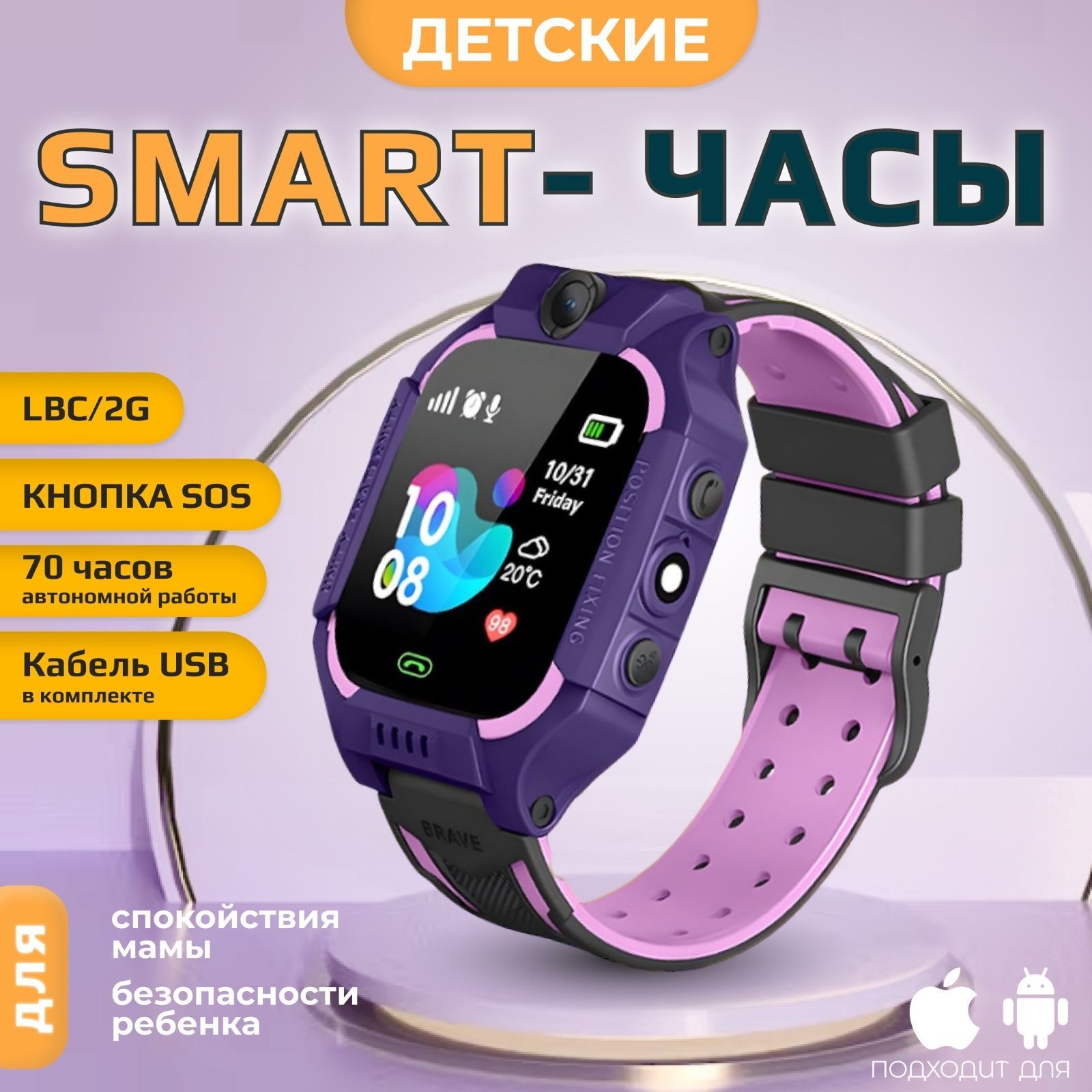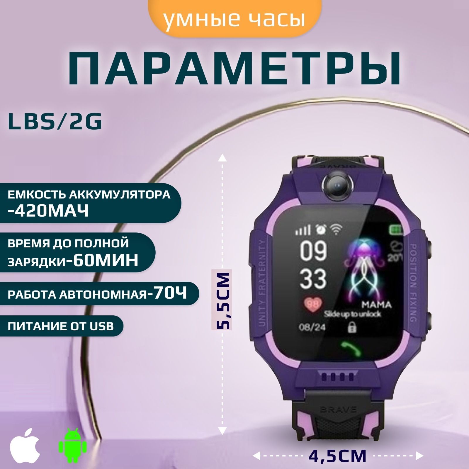 Умные часы для детей часы смарт, 40mm, фиолетовый