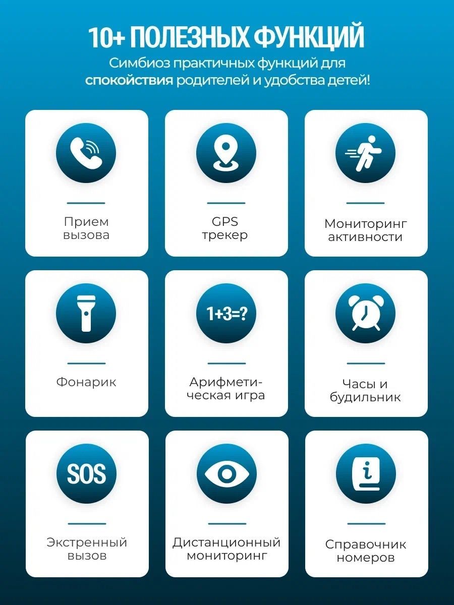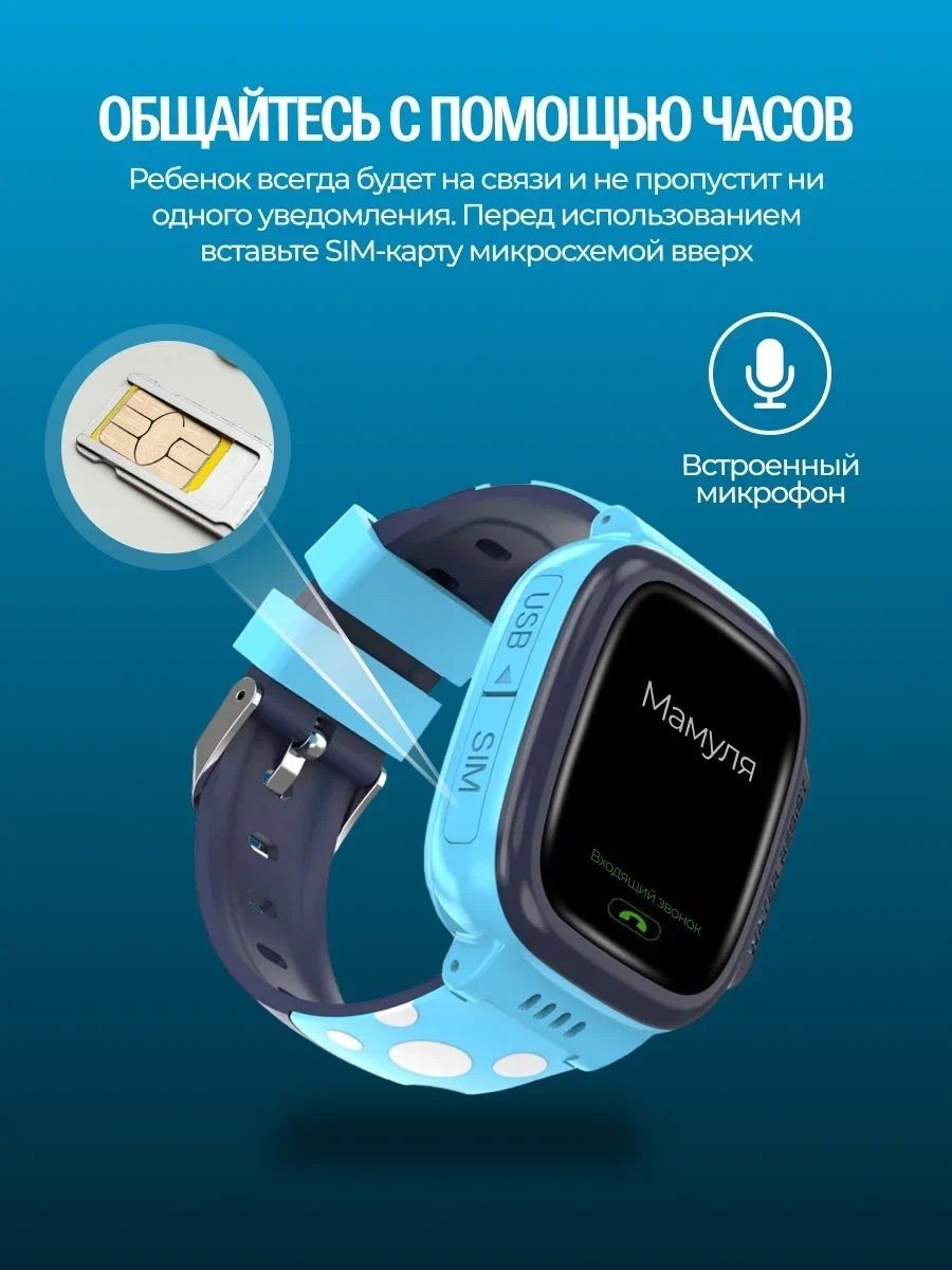 Детские часы поддерживают сим карту для звонков, оснащены будильником и кнопкой SOS для экстренных ситуаций.