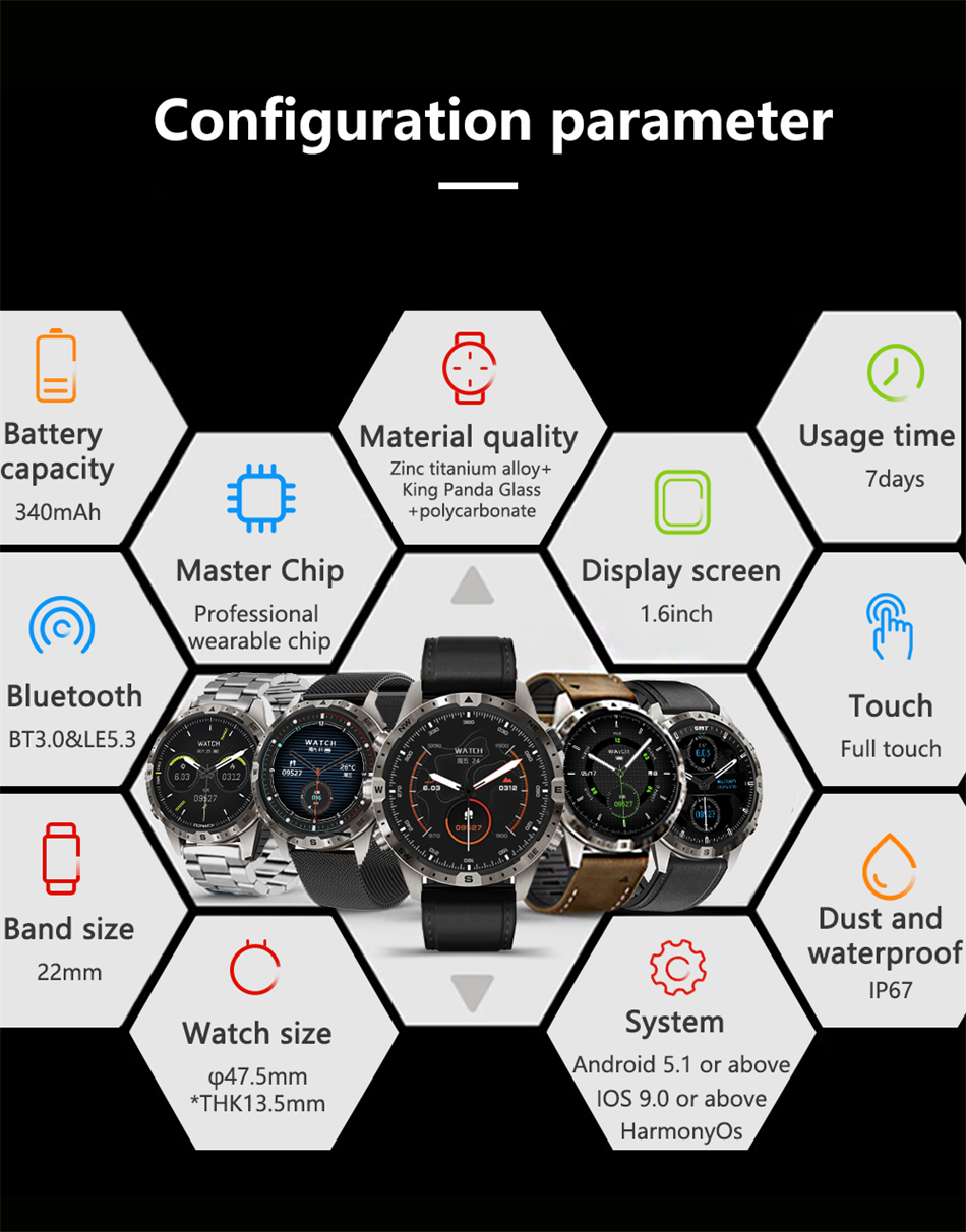 ОСНОВНЫЕ ФУНКЦИИ: система контроля доступа NFC, вызов Bluetooth, компас, погодные данные, записи упражнений GPS (шагомер, расстояние, расчет калорий), режим упражнений, нажатие сообщений, хранение информации, мониторинг сердечного ритма, мониторинг сна, измерение артериального давления, измерение насыщения крови кислородом, секундомер, управление камерой, Управление музыкой,