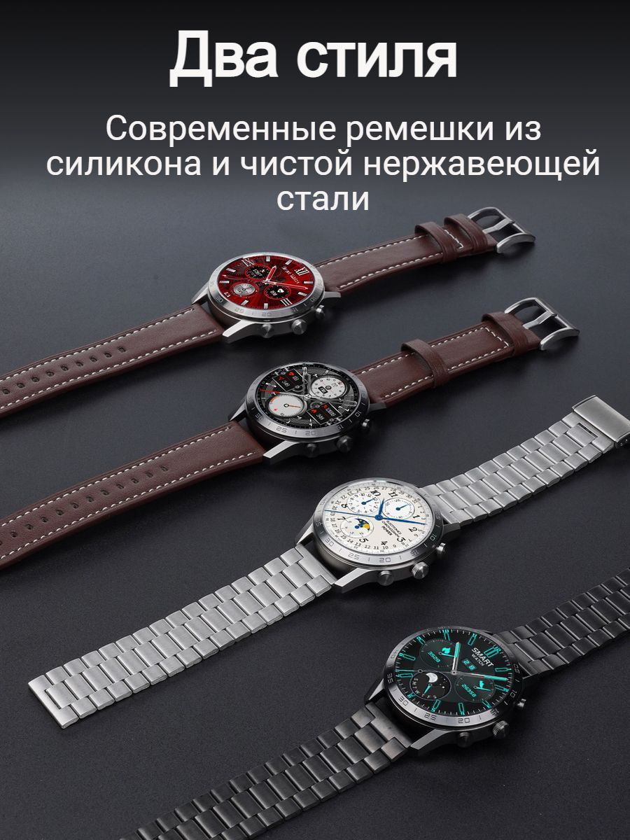 Смарт-часы - 1 шт. Беспроводное зарядное устройство - 1 шт. Ремешки - 2 шт.(металлический и силиконовый) Инструкция на русском языке - 1 шт. Упаковочная коробка - 1 шт.