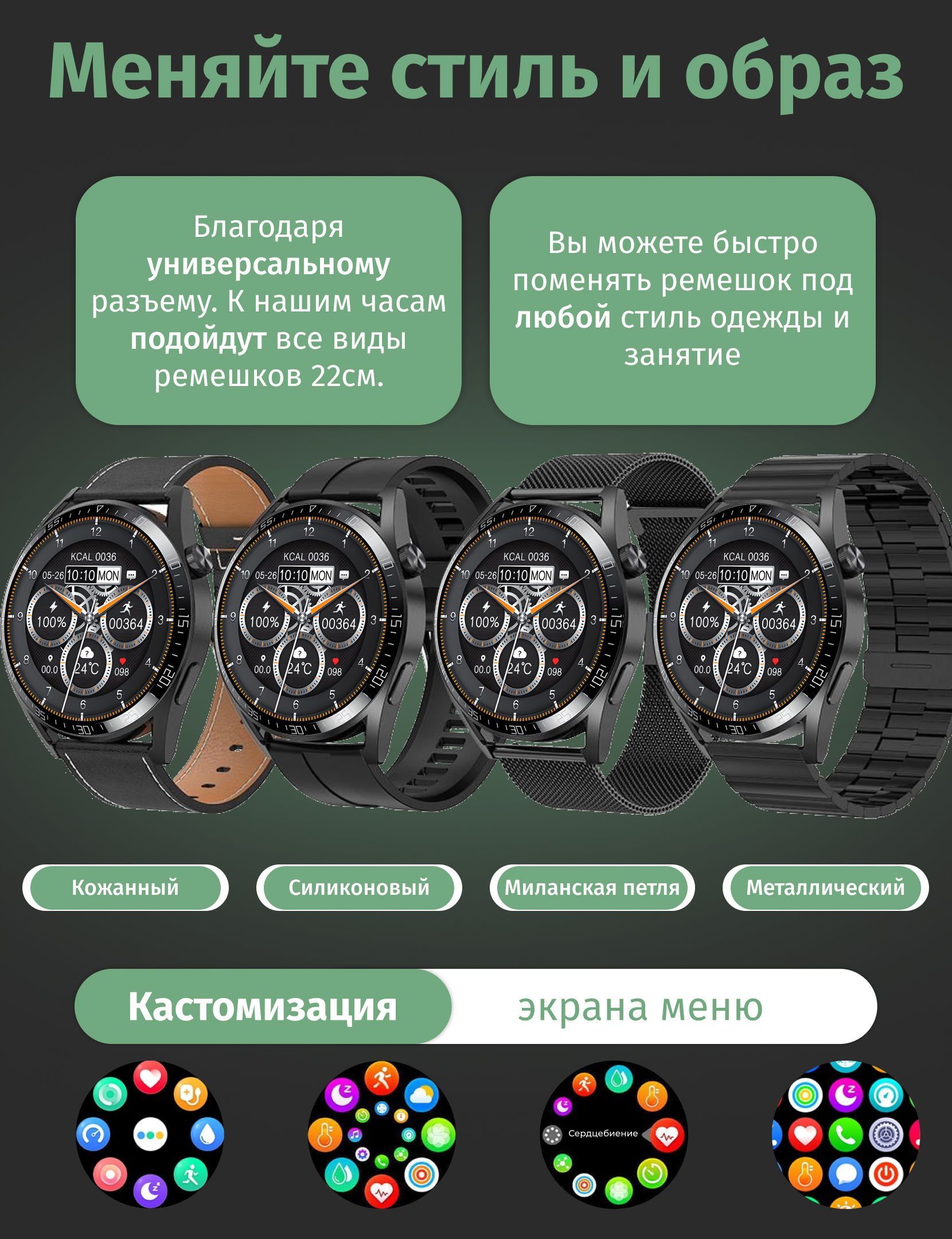 • Три ремешка в комплекте: Мы думали о вашем комфорте. В комплекте с часами идут три ремешка: силиконовый, кожанный и металлический премиального качества, чтобы удовлетворить любой ваш стиль и настроение.