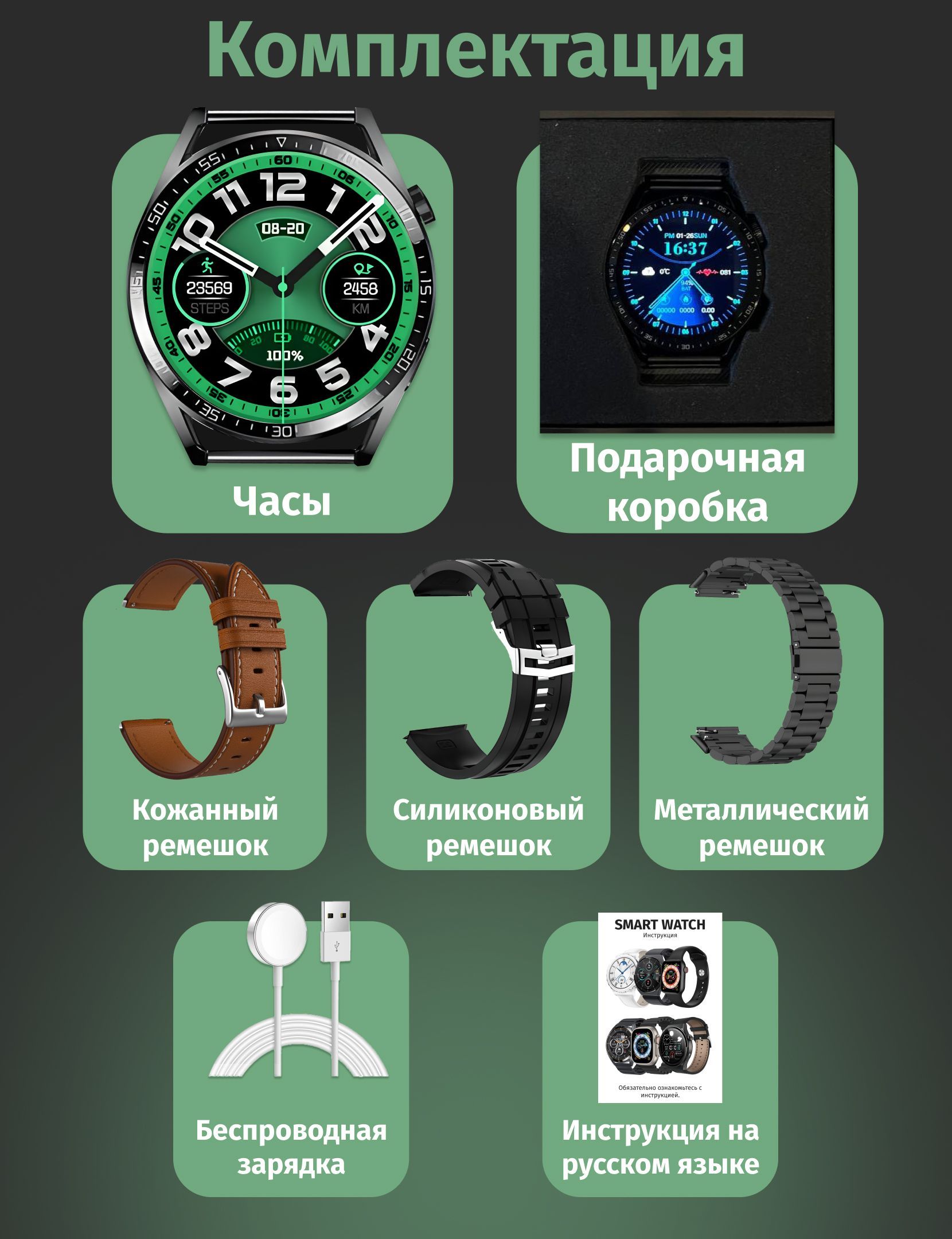 Смарт часы; Металлический ремешок; Силиконовый ремешок; Кожаный ремешок (коричневый); Беспроводная зарядка (таблетка); Инструкция на русском; Qr-код на видеоинструкцию.