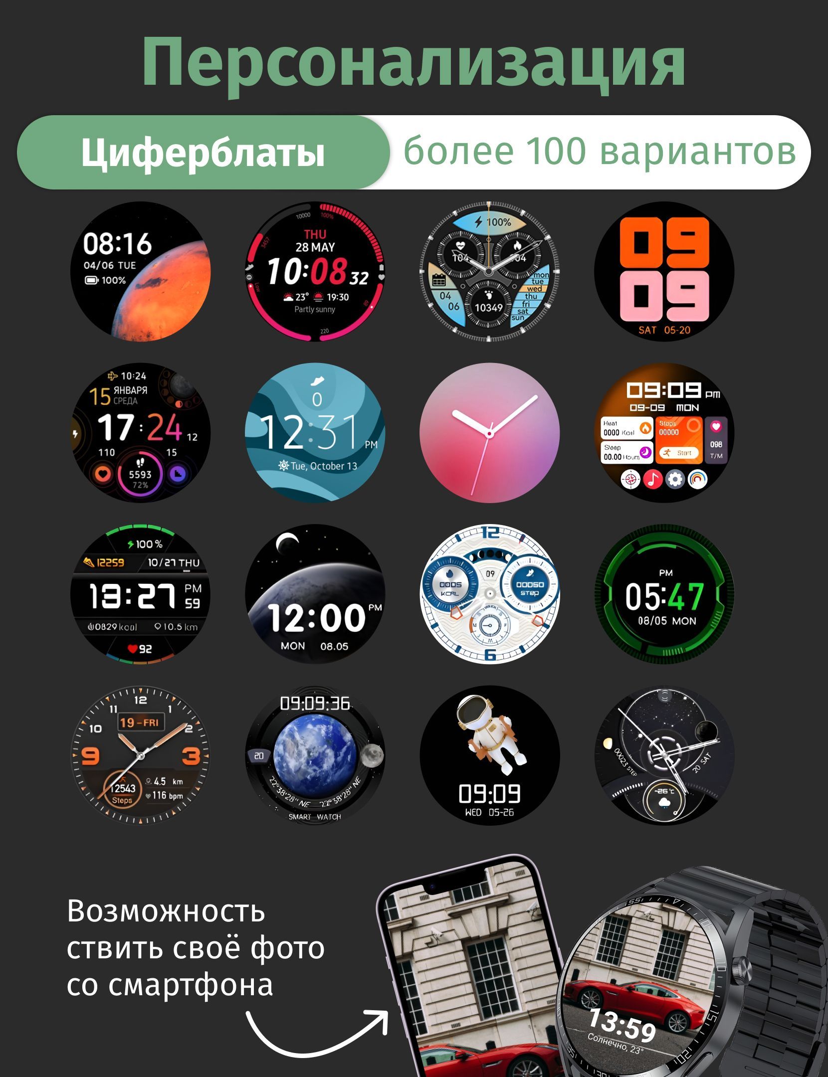 • Элегантный дизайн: Наши часы не только мощные, но и стильные. Новые циферблаты с премиальной анимацией и красивым, дорогим дисплеем без надписей подчеркивают ваш статус и вкус.
