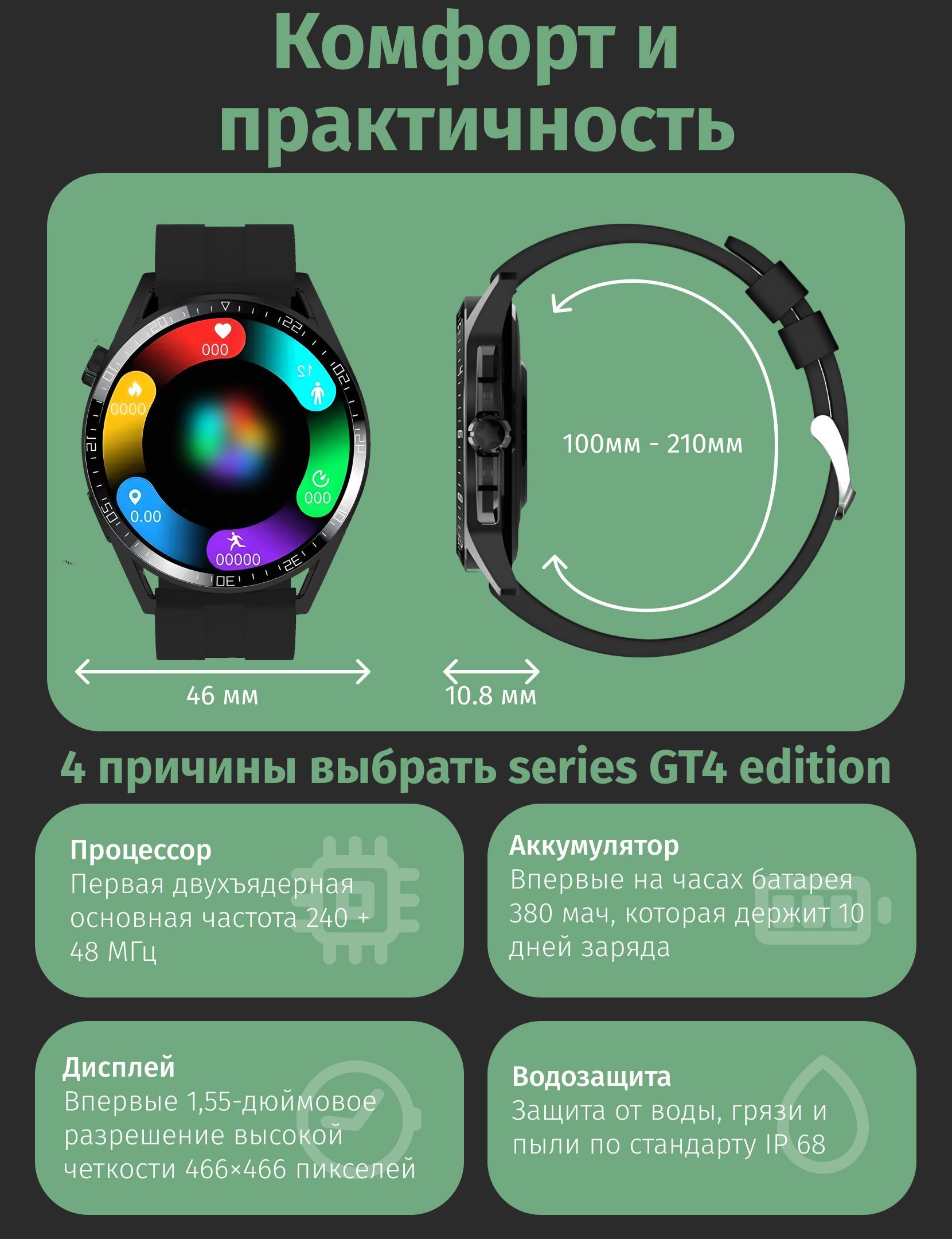 Смарт-часы series GT4 (новинка 2023 года) - это ультрасовременные аксессуары для заботы о вашем здоровье и образе жизни. На первый взгляд их шикарный дизайн завораживает, а функциональность не оставляет шансов конкурентам. Смарт часы не просто показывают время, они следят за вашими биометрическими показателями в реальном времени. От подсчета калорий и мониторинга сна до постоянного контроля пульса и давления - эти часы всегда рядом, чтобы помочь вам следить за вашим здоровьем.