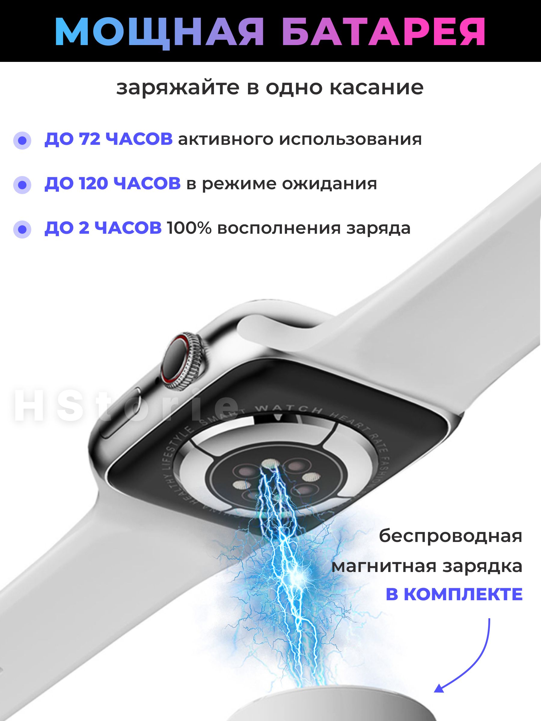 Смартчасы 8 серии оснащены мощным аккумулятором с большой ёмкостью и низким уровнем энергозатрат. Длительность в режиме ожидания до 5 дней. А беспроводная зарядка восполнит энергию полностью не более чем за 120 минут.
