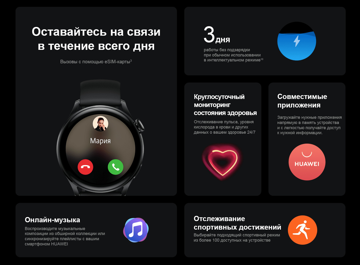в чрезвычайной ситуацииНикогда не знаешь, когда может произойти чрезвычайная ситуация, поэтому лучше заранее разработать план действий. Падение приводит к переключению HUAWEI WATCH 3 в режим чрезвычайной ситуации⁸. Выбранному вами контакту приходит уведомление. Вы также можете 5 раз нажать на верхнюю кнопку, чтобы обратиться в службу экстренной помощи.Заботьтесь о здоровьеПросматривайте ежедневные и еженедельные записи о количестве шагов, периодах активности, сожженных калориях, качестве сна, уровне стресса и т.д.⁷Поддерживайте формуФитнес-трекер на вашем запястье. Выбирайте подходящий режим тренировки из более 100 доступных — 19 профессиональных режимов, режимы для тренировок в помещении и на открытом воздухе и 85 пользовательских режимов. Часы автоматически распознают 6 типов наиболее популярных тренировок. Данные о вашем здоровье отображаются в приложении HUAWEI Health на вашем смартфоне. Также часы оснащены датчиком геолокации GNSS, который позволяет отслеживать маршруты тренировок на открытом воздухе.Высокая производительностьВысокая производительность в сочетании с небывало низким энергопотреблением — одна из отличительных особенностей современных умных часов. С часами HUAWEI WATCH 3 вы будете двигаться только вперед, несмотря ни на что.Удобная зарядкаНикому не нравится тратить много времени на зарядку устройства. Используйте свой смартфон HUAWEI для обратной зарядки⁹ HUAWEI WATCH 3 и не беспокойтесь об уровне заряда батареи.Живите по своим правиламHUAWEI WATCH 3 оснащены архитектурой с двумя процессорами, что позволяет не только повысить производительность, но и обеспечить более сбалансированную работу устройства. Алгоритм Smart Power-Saving Algorithm 3.0 позволяет круглосуточно отслеживать данные о вашем здоровье и тренировках в течение нескольких дней подряд. Батареи хватает на 3 дня работы при обычном использовании в интеллектуальном режиме¹⁰ и 14 дней использования в режиме энергосбережения¹⁰.В режиме энергосбережения14 днейПри обычном использовании