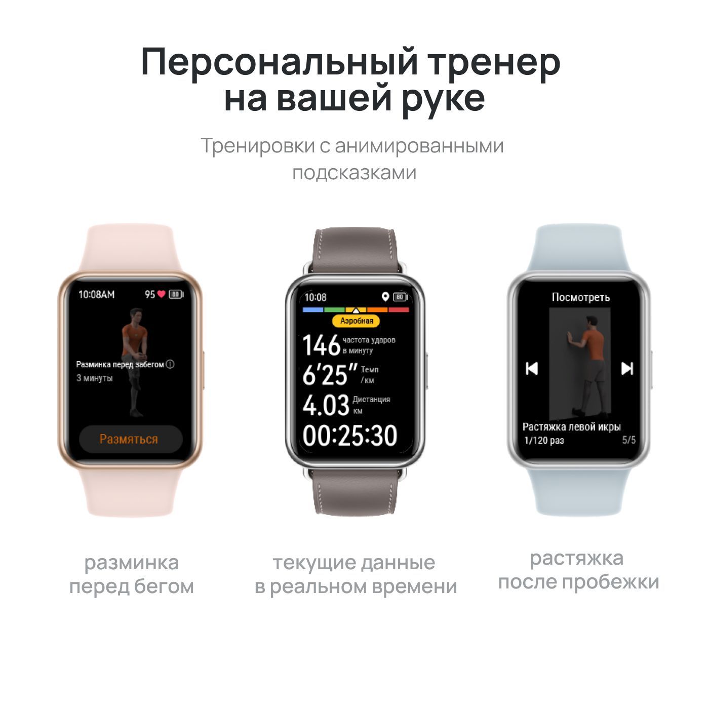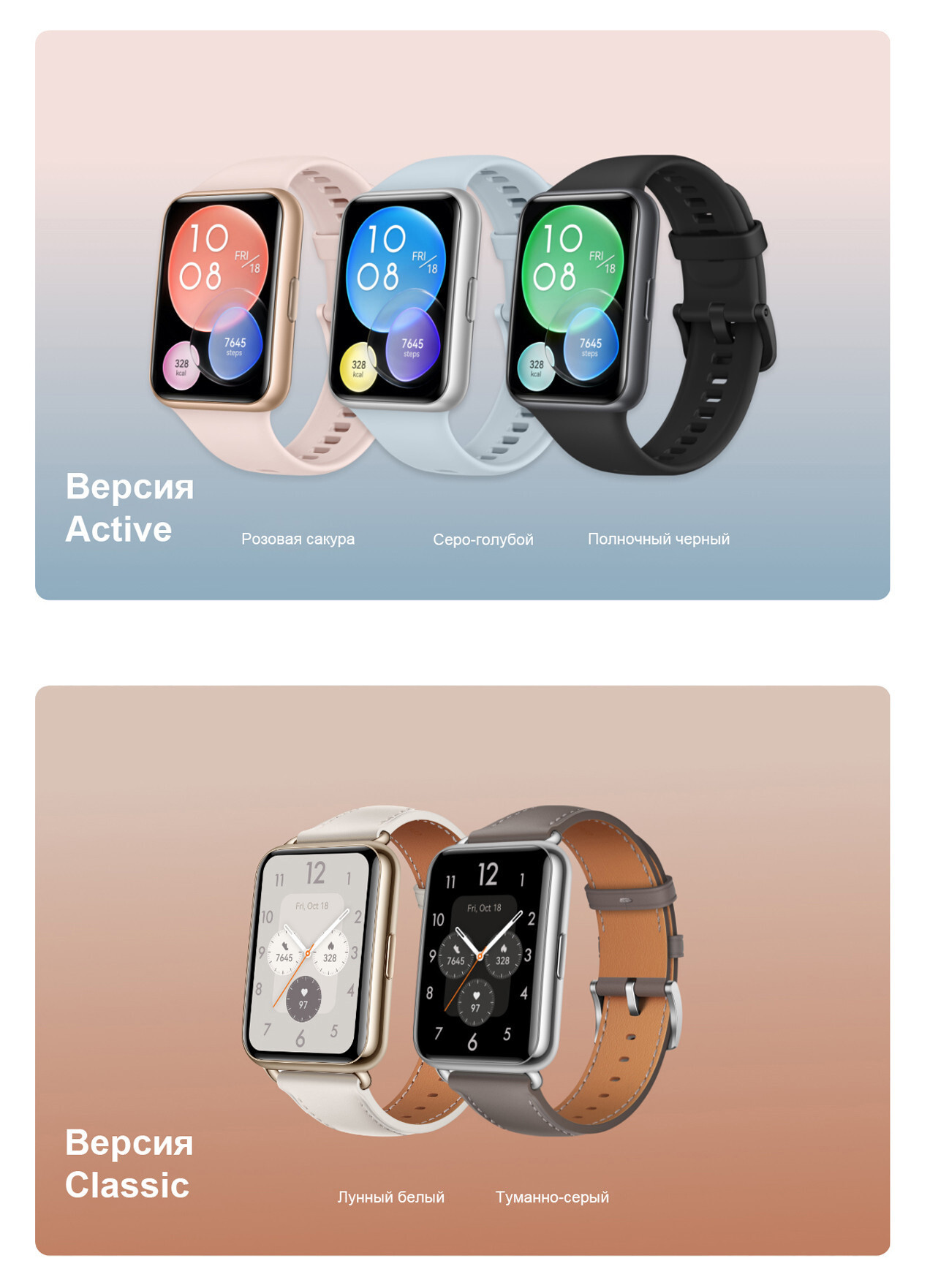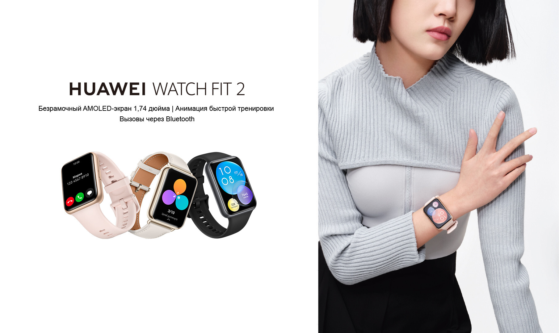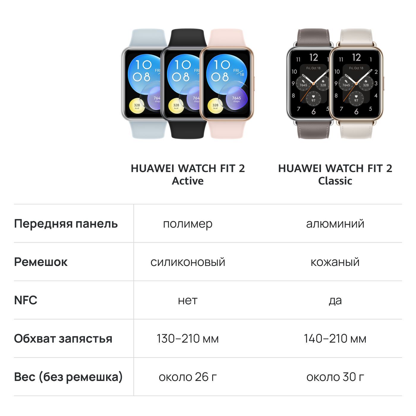 Описание: 6 причин влюбиться в HUAWEI WATCH FIT 2Стильный дизайн и удобное управлениеСмарт-часы HUAWEI WATCH FIT 2, оснащенные 1,74-дюймовым безрамочным AMOLED-экраном, позволяют с легкостью получать доступ ко всей необходимой информации. Умные часы пригодятся в различных ситуациях от тренировок до ответа на входящие вызовы.Соотношение экрана к корпусу устройства²72,2%Полезная площадь экрана увеличена на²18,6%Циферблаты на любой вкусHUAWEI WATCH FIT 2 поддерживают функцию циферблата-заставки³ для всех вариантов, представленных в магазине циферблатов. Смарт-часы поддерживают множество функций, которыми вы можете с легкостью управлять с помощью интуитивно понятного интерфейса.Большой выбор ремешковВерсию Active отличает сдержанный стиль и гладкая текстура, а версия Classic привлекает внимание за счёт благородной текстуры натуральной кожи. Выберите подходящий материал (силикон или кожа) и цвет (ремешки представлены в 5 цветовых решениях) ремешка, и умные часы станут элегантным аксессуаром, дополняющим ваш образ.Удобная замена ремешкаHUAWEI WATCH FIT 2 оснащены инновационной конструкцией крепления⁴, позволяющей с легкостью менять ремешки. Хотите использовать ремешок другого цвета? Одним нажатием снимите ремешок, а затем прикрепите новый.Передача файлов одним касаниемУстановите изображение со смартфона в качестве циферблата часов. Одним касанием⁵ передавайте файлы с вашего мобильного устройства на часы и просматривайте их на большом квадратном экране. Теперь на дисплее отображается еще больше контента.Длительное время работы батареиПолного заряда батареи смарт-часов хватает на 10 дней обычного использования или 7 дней интенсивного использования⁶. Носите устройство в любое время и в любом месте, не беспокоясь об уровне заряда батареи. Зарядите умные часы в течение 5 минут и используйте их весь день⁷.10 днейработы батареи при обычном использовании⁶7 днейработы батареи при интенсивном использовании⁶Оставайтесь на связиHUAWEI WATCH FIT 2 поддерживают Bluetooth-вызовы⁸, быстрые ответы на сообщения⁹ и импорт контактов. Отвечайте на входящие вызовы с помощью умных часов, где бы вы ни находились.HUAWEI Assistant∙TODAYСмахните вправо, чтобы открыть экран HUAWEI Assistant TODAY, на котором вы можете просмотреть информацию о погоде или управлять воспроизведением музыки.Воспроизведение музыкиHUAWEI WATCH FIT 2 поддерживают воспроизведение плейлистов смартфона¹⁰ и подбирают музыку в зависимости от выполняемой тренировки.Ведите активный образ жизниСмарт-часы позволяют повысить эффективность тренировок, предоставляя анимированные подсказки и голосовые рекомендации по разминке для 7 режимов тренировок¹¹, включая бег, езду на велосипеде и плавание.Разминка перед бегомРазомнитесь перед беговой тренировкой, следуя анимированным подсказкам.Данные беговой тренировки в режиме реального времениЧасы отслеживают пульс и отображают его на экране, а также предоставляют звуковые предупреждения о превышении порогового значения в режиме реального времени. Данные беговой тренировки (расстояние, темп, пульс и т.д.) озвучиваются каждый километр, предоставляя вам всю нужную информацию во время бега.Растяжка после пробежкиСледуйте анимированным подсказкам после беговой тренировки, чтобы расслабить мышцы. Растяжка помогает сделать занятия спортом еще эффективнее.Ведете сидячий образ жизни?