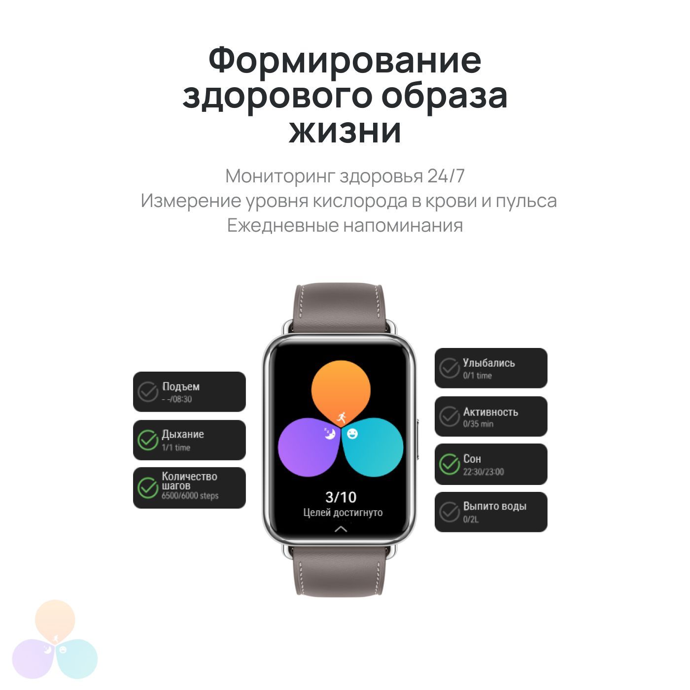 образа жизниУмные часы помогают внедрять в повседневную жизнь полезные привычки, например, налаживать режим сна и время пробуждения, пить достаточно воды и заниматься спортом. В приложении HUAWEI Здоровье можно настроить ежедневные задания. Поддерживайте свое эмоциональное и физическое состояние с HUAWEI WATCH FIT 2.Точное измерение пульсаHUAWEI WATCH FIT 2 непрерывно отслеживают ваш пульс независимо от положения вашего тела. Умные часы уведомляют вас о превышении порогового значения пульса и о том, когда частота сердечных сокращений в состоянии покоя слишком низкая¹².Круглосуточный мониторинг уровня кислорода в кровиУровень кислорода в крови (SpO2) — это ключевой показатель, позволяющий оценить здоровье дыхательной системы и метаболизм. Смарт-часы оснащены высокоточным датчиком¹, который круглосуточно отслеживает уровень кислорода в крови. Когда этот показатель слишком низкий, на устройстве отображаются уведомления.Подготовка к особым днямС легкостью отслеживайте ваш менструальный цикл и получайте информацию о фазах цикла. Умные часы заранее уведомят вас о приближении менструации¹³.Мониторинг фаз и времени снаТехнология HUAWEI TruSleepTM 2.0 отслеживает фазы и время вашего сна. Она поддерживает распознавание 6 проблем, связанных со сном, и предоставляет более 200 рекомендаций по улучшению качества сна. Технология позволяет отслеживать и записывать данные во время длительного сна ночью и короткого дневного отдыха.Определение уровня стрессаТехнология HUAWEI TruRelaxTM идентифицирует ваш уровень стресса в течение дня и предоставляет дыхательные упражнения, позволяющие расслабиться и успокоиться.Создайте уникальный образ⁴Подберите часы, отражающие ваш стиль