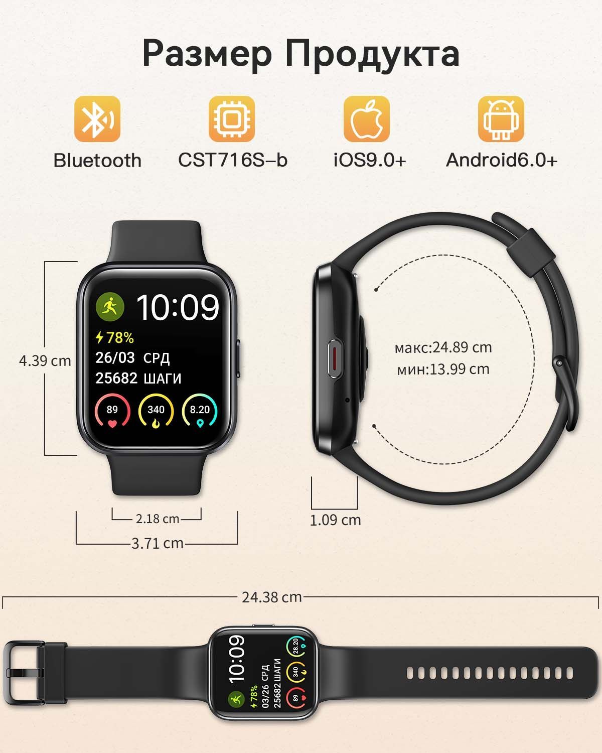 Умные часы ID208 Смарт часы мужские, женские, 1.69" Smart Watch Bluetooth (блютуз), счетчик калорий,Информационное уведомление , 35mm, черные