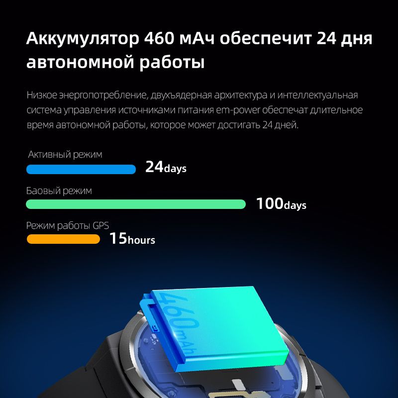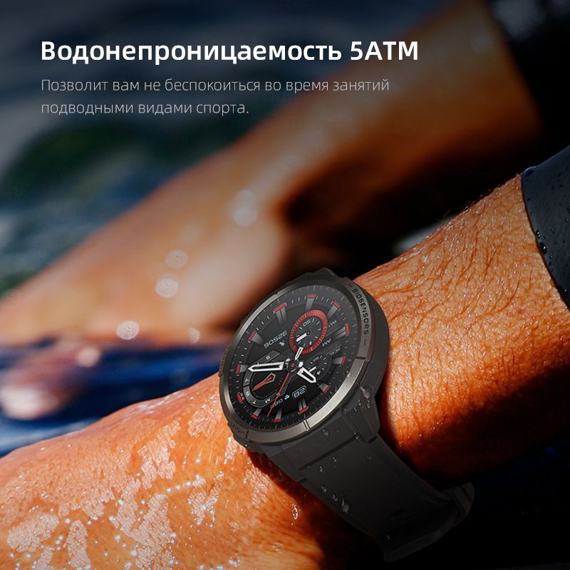 Благодаря встроенному аккумулятору емкостью 460 мАч автономная работа в стандартном режиме может достигать 24 дней, а в режиме ожидания - до 100 дней. Длительное время работы избавит вас от необходимости беспокоиться о заряде батареи и заряжать часы. Корпус имеет класс водонепроницаемости 5 АТМ, который позволит вам заниматься дайвингом или плаванием не снимая их.