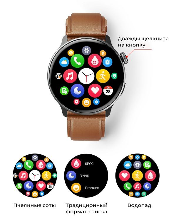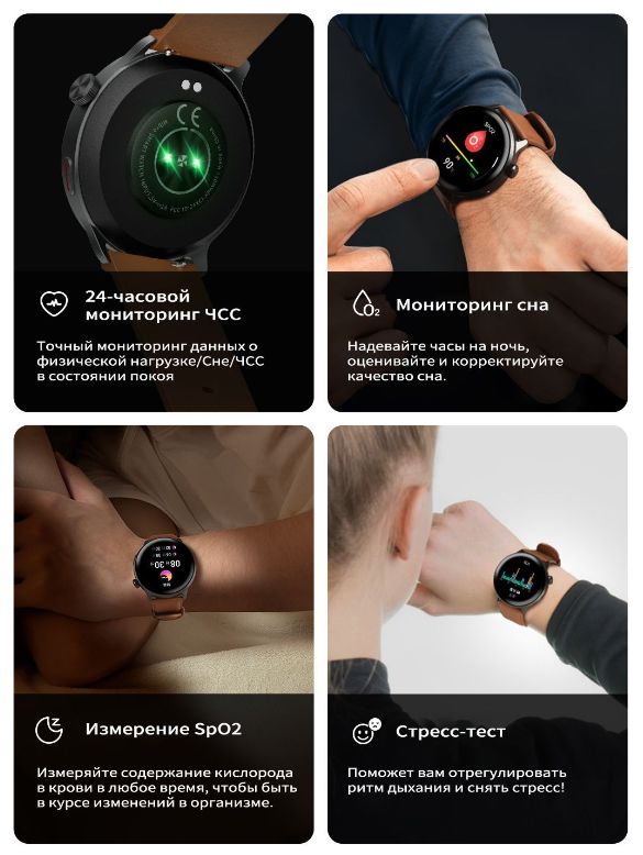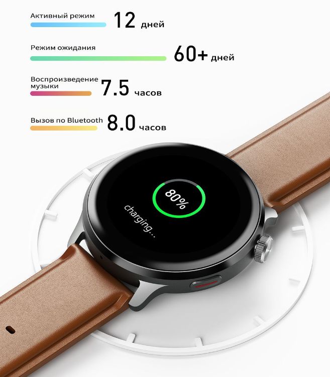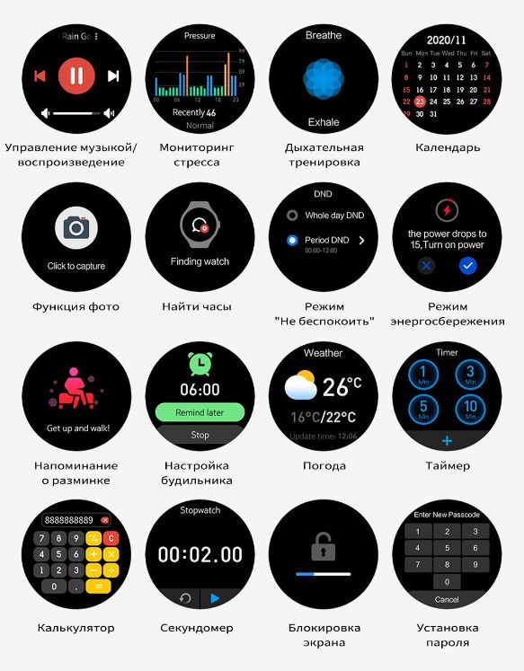 Поддержка функции Always On DisplayМножество вариантов циферблатовЦиферблат часов можно свободно переключать, вращая заводную головку, 100+ циферблатов ждут вашего выбора.Настраиваемый вид менюДважды щёлкните кнопку на странице главного меню, чтобы переключаться между несколькими стилями меню.Ответ в один кликЕсли вы заняты, просто нажмите на экран, чтобы ответить на сообщение или отклонить вызов.Вызов по BluetoothПросто поднимите запястье для ответа.Двухъядерный чипДвухъядерный чип Bluetooth, двухъядерная архитектура с низким энергопотреблением, встроенный графический ускоритель 2.5 DGPU обеспечат более плавную работу и низкое энергопотребление.