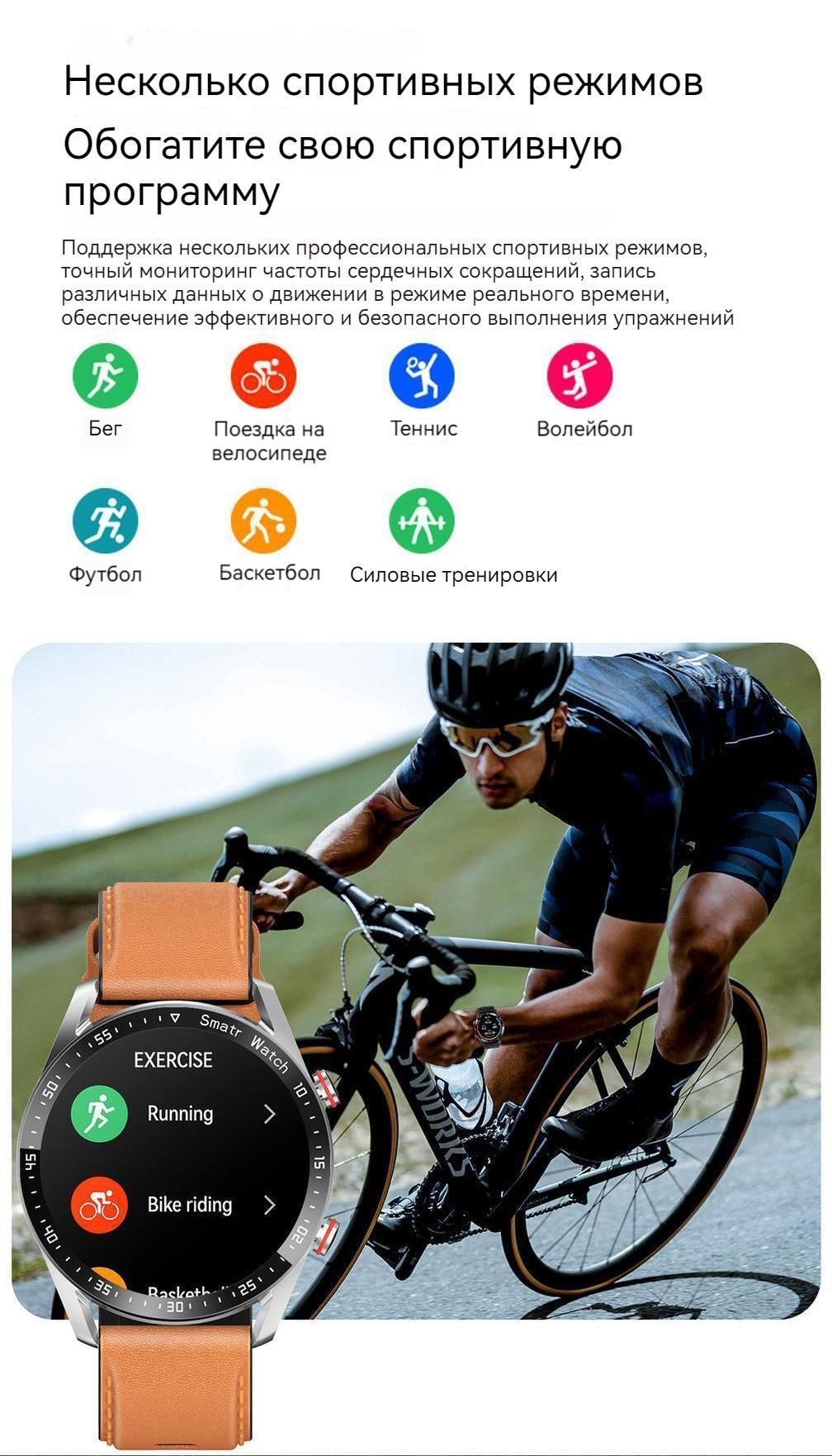 Различные спортивные режимы, такие как бег, езда на велосипеде, теннис, волейбол, футбол, баскетбол, силовые тренировки и т. д., записывают шаги, калории, расстояние, траекторию и другие данные.