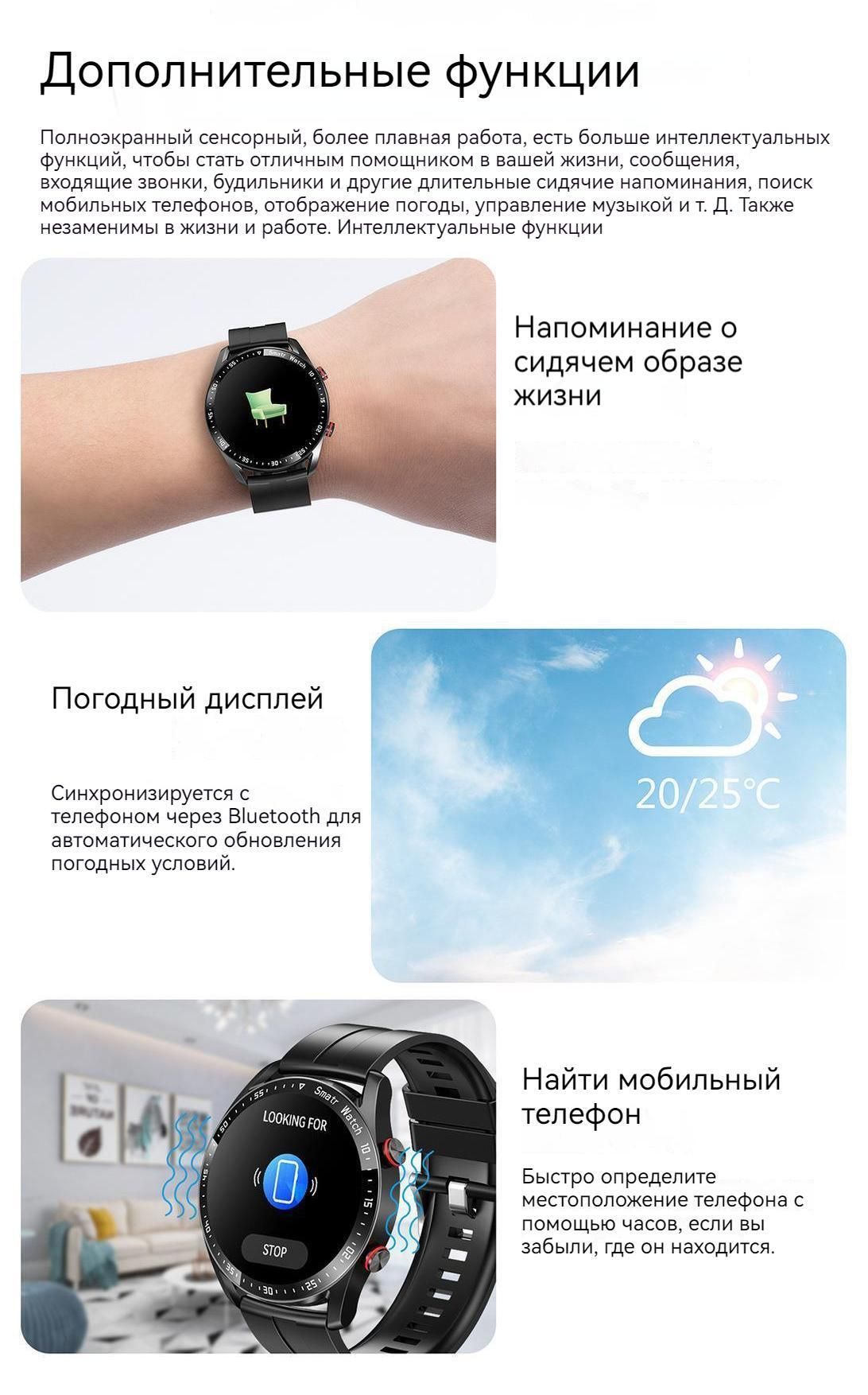 Отклонение входящих вызовов одной клавишей, удаленная фотосъемка, управление и воспроизведение музыки, отображение погоды, отображение экрана поднятием запястья, таймер, поиск устройства, регулировка яркости, режим «Не беспокоить», вибрация и т. д.