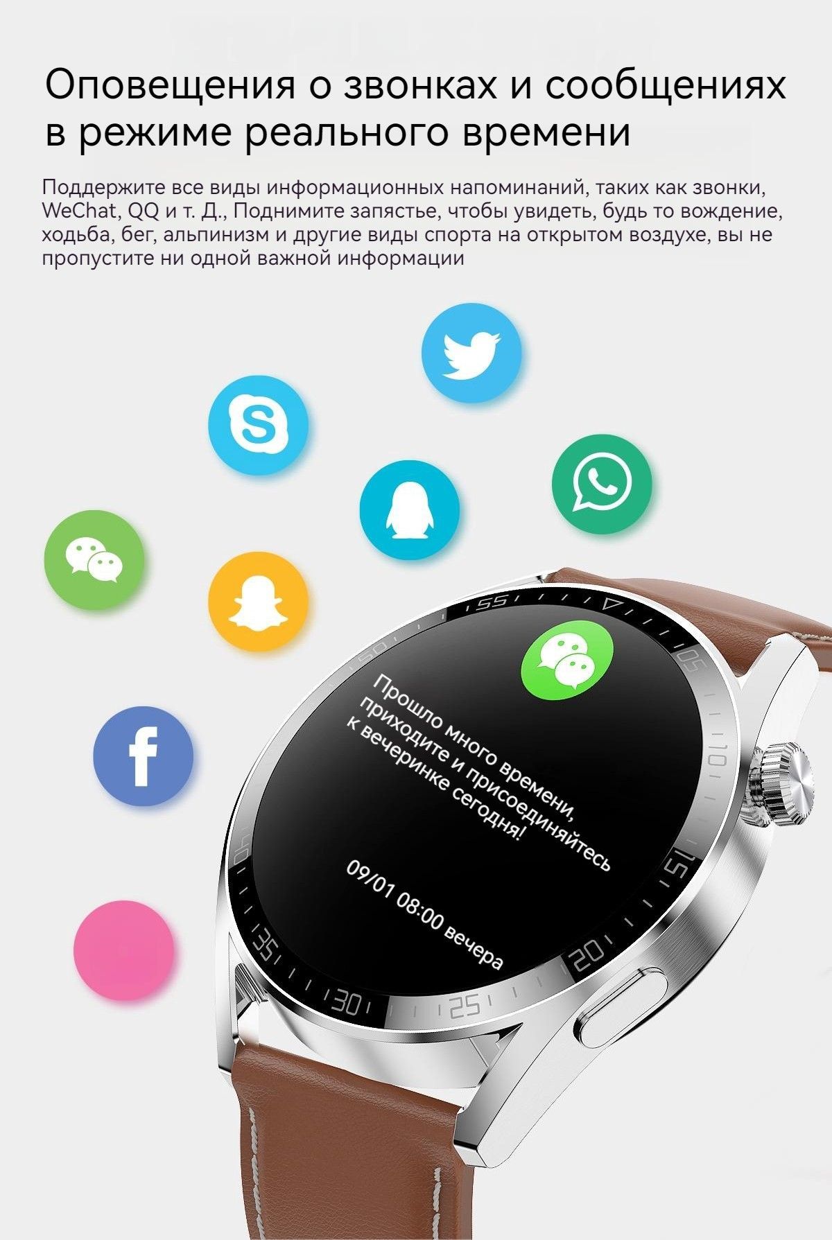 • Отправка сообщений в режиме реального времениПоддержите Facebook, Twitter, Instagram, Skype, WhatsAPP, Line, Kakao Talk, WeChat, QQ и другую информацию, просто поднимите запястье, чтобы увидеть, вы не пропустите ни одной важной информации