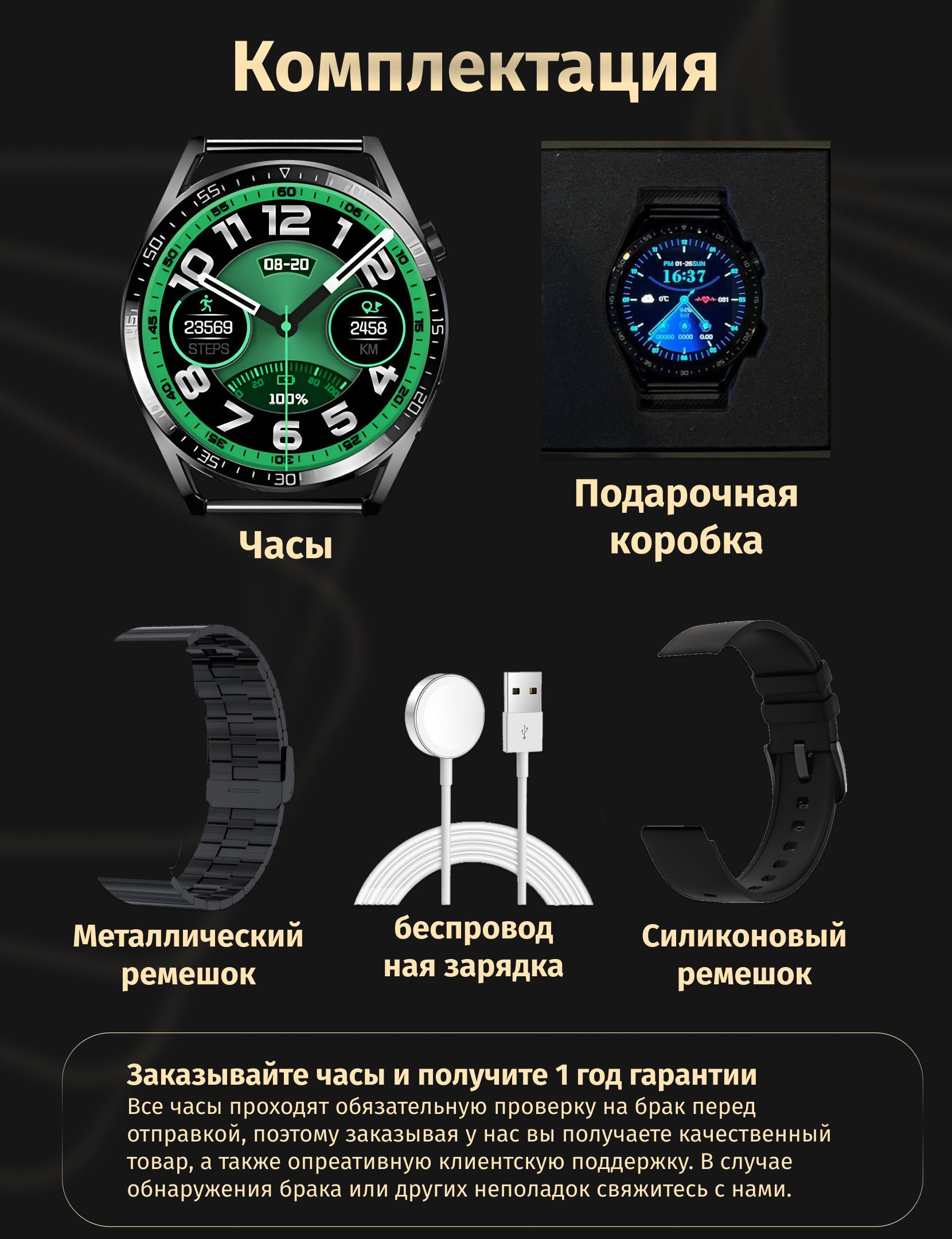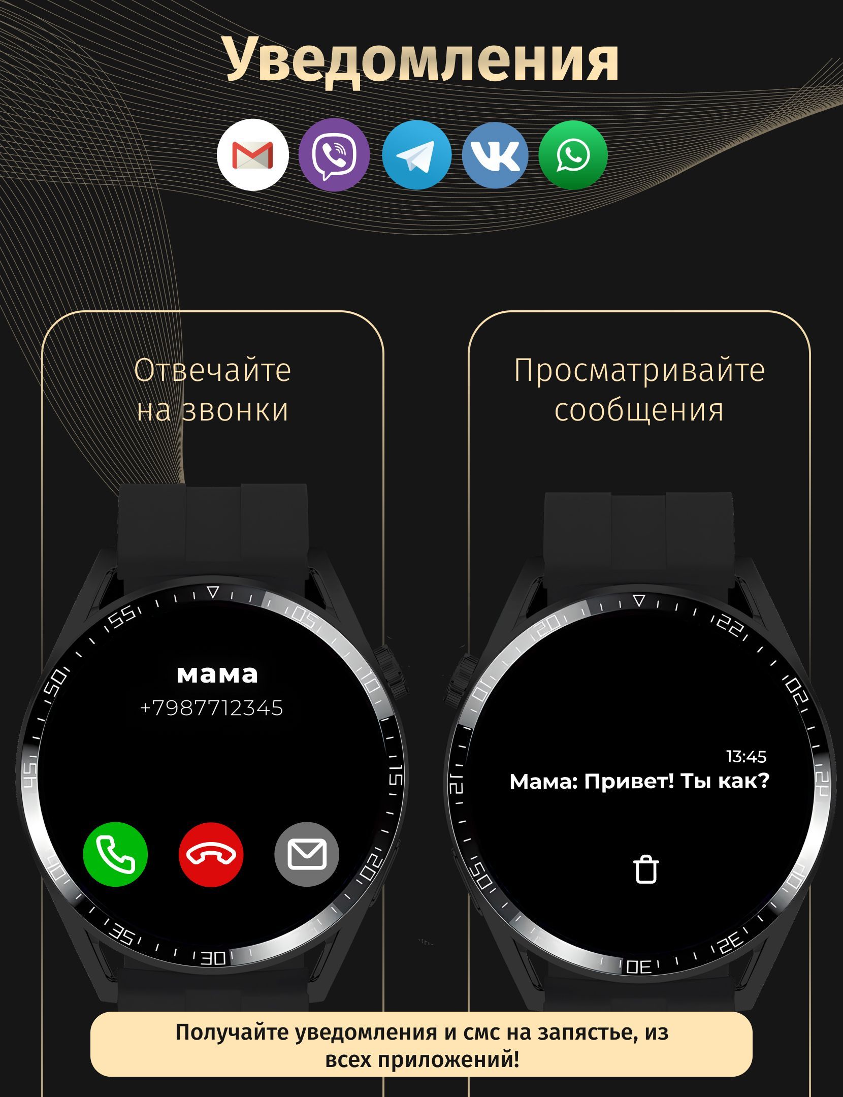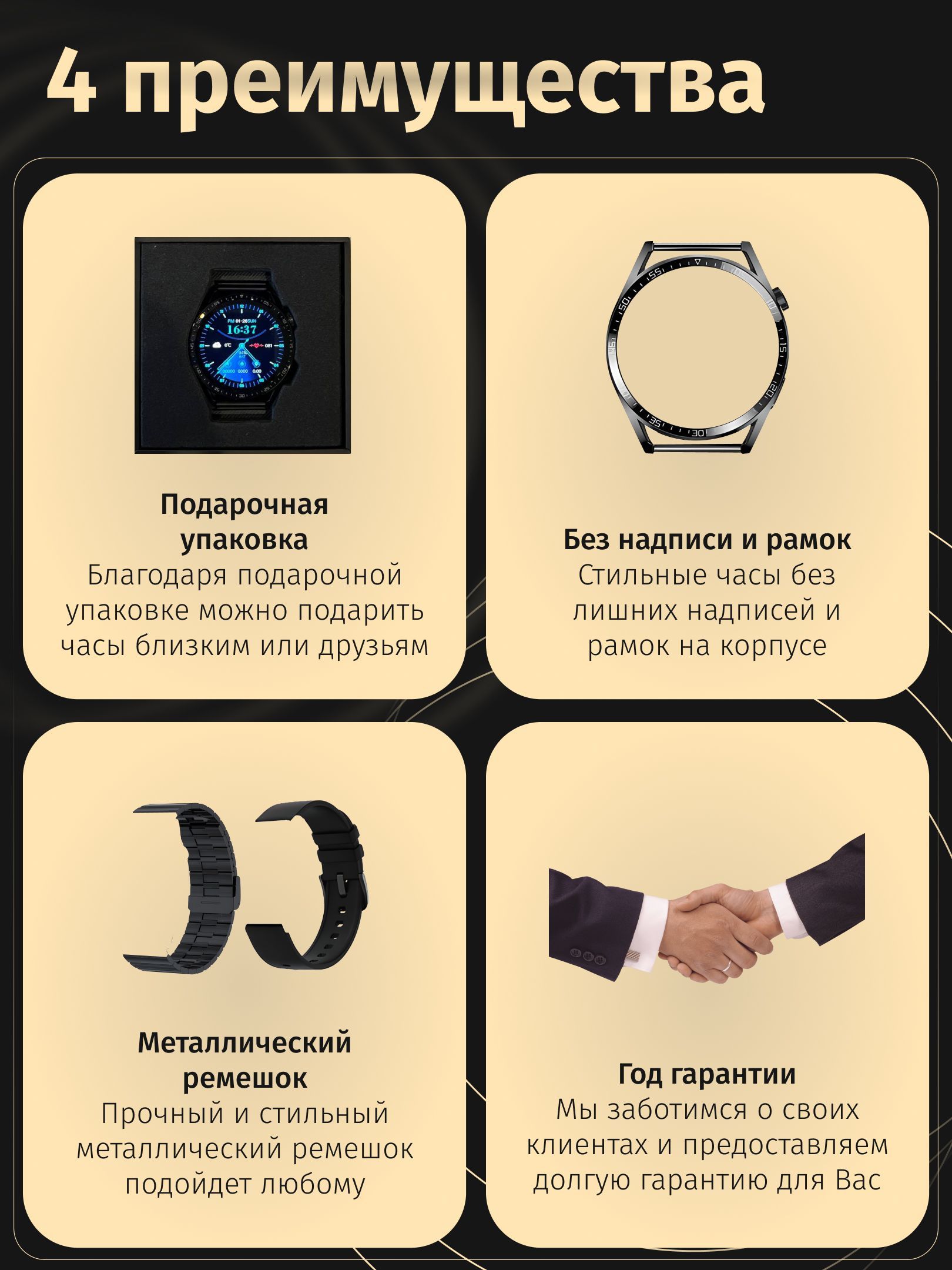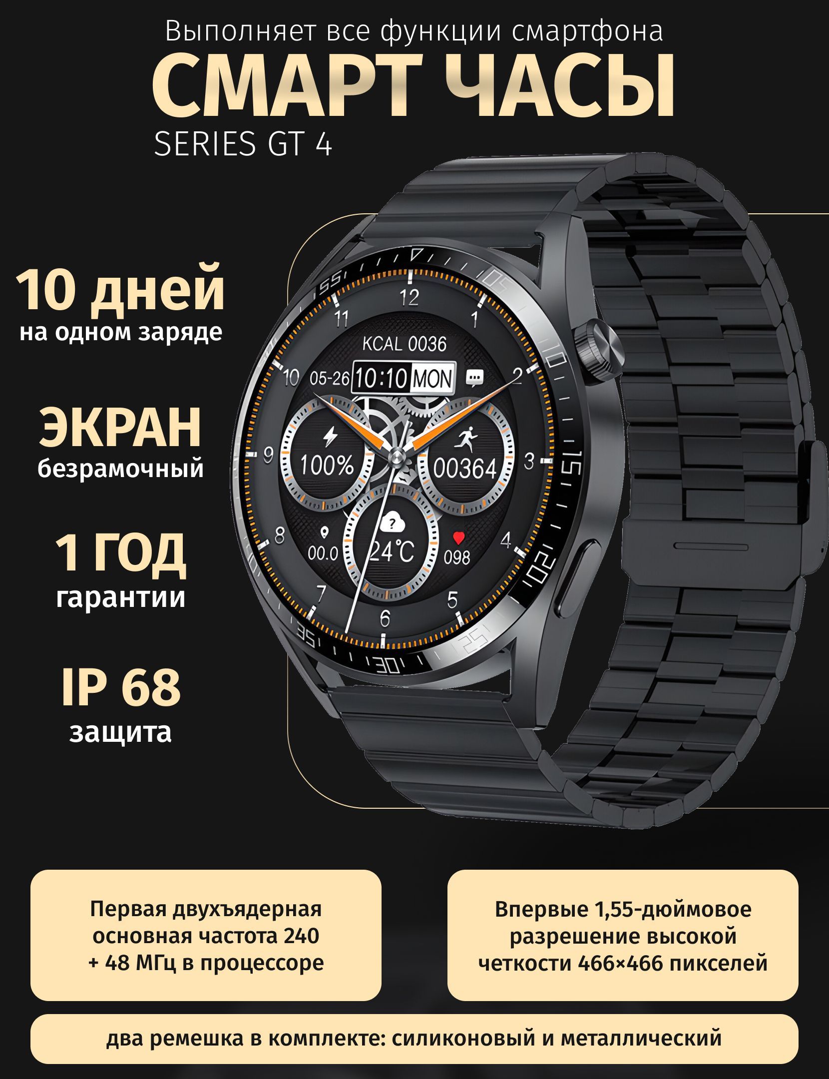 Премиальная серия смарт часов GT4 series  (новинка 2023 года) - это совершенно новые наручные смарт часы браслет шикарного дизайна и огромного функционала - от звонков и приема сообщений и уведомлений до контроля. Вашего состояния здоровья в реальном времени, а именно подсчета калорий, мониторинга сна, пульсометра, шагомера, измерения давления. и др. Часы электронные на руку отлично подходят как детские, так и мужские или женские наручные часы. В комплект входят - часы с ремешком, беспроводная зарядка, инструкция и гарантийный талон. Часы Smart watch произведены из крепкого алюминиевого корпуса и имеют степень защиты IP 68. Часы электронные принимают уведомления с мессенджеров и сообщения с телефона и являются отличным туристическим аксессуаром. С их помощью Вы можете говорить с собеседником, не вынимая телефон с кармана или сумки, ведь в них встроен очень хороший динамик и микрофон. Смарт-часы сопрягаются с телефонами с операционными системами IOS и Android. Это отличное дополнение к Вашей электронике. Привлекательный и минималистичный дизайн, позволяющий использовать фитнес часы наручные с любой одеждой и выбранным вами образом. Уверены, что вам придутся по нраву современные часы мужские спортивные от проверенного производителя. К часам легко пристегиваются съемные браслеты с надежной застежкой. 2 ремешка идут в подарок (силиконовый, металлический) так же можно приобрести отдельно кожаный ремешок и миланская петля. Стильные смарт часы мужские круглые, умные часы мужские очень красиво смотрятся на руке и подойдут для людей всех возрастов. Для настройки и удобного взаимодействия телефона со смарт часами разработано приложение, скачать которое можно считав QR код в часиках, в инструкции, либо на коробке. Наручные часы для мужчин, smart-часы - это полноценный фитнес браслет мужской, который имеет защиту от попадания пыли и влаги. Смарт часы с измерением давления очень надежные: корпус выполнен из высококачественного алюминиевого сплава, а циферблат из ударопрочных материалов. Эти часы телефон выбирают за плавную анимацию, быстрый сенсор, наличие калькулятора и мульти-спортивных режимов.