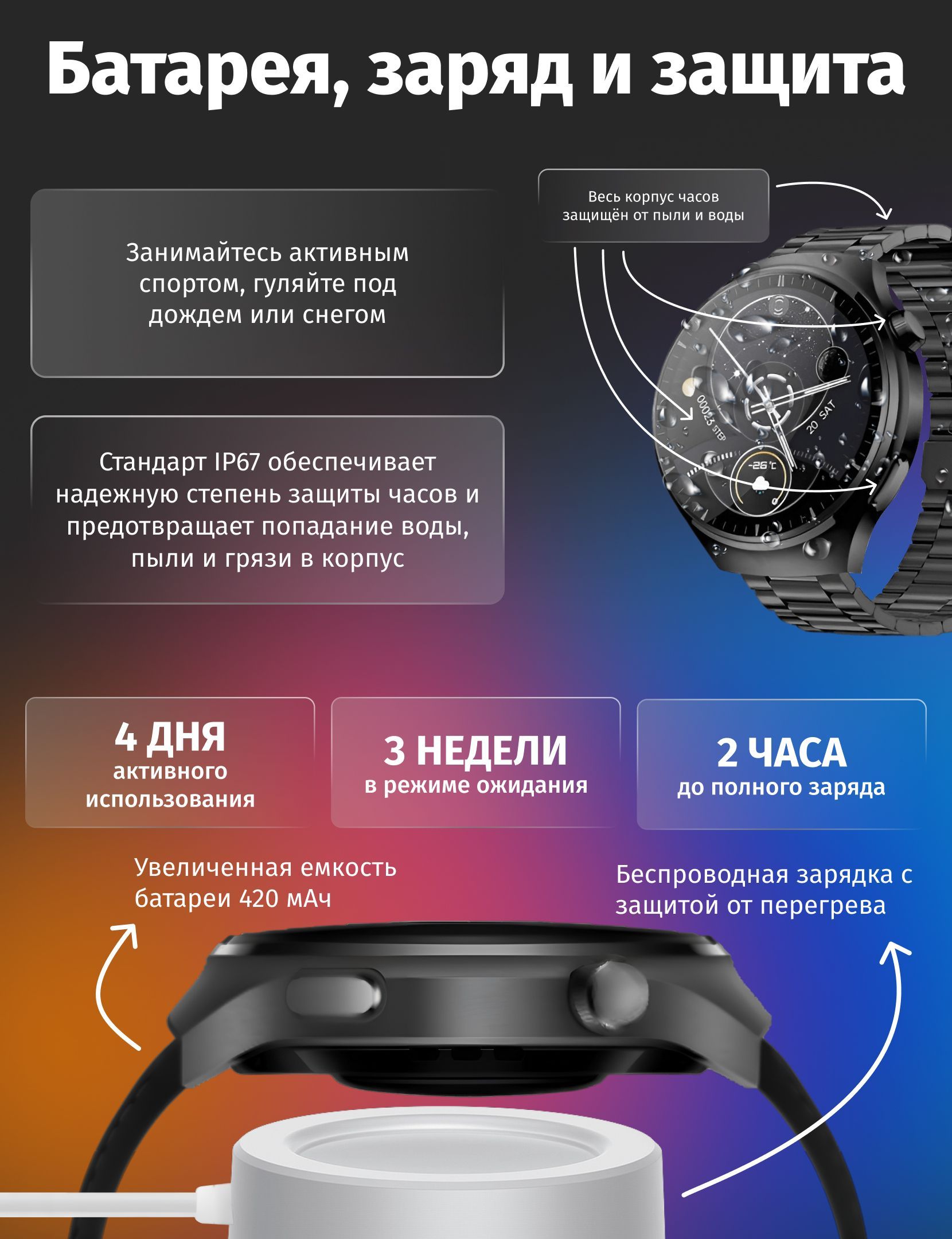 •Smart-Watch заряжается с помощью беспроводной магнитной зарядки, а аккумулятор увеличенной мощности держит заряд до 10 дней. Более 100 вариантов дизайна экрана на любой вкус с цифровым или аналоговым классическим циферблатом.