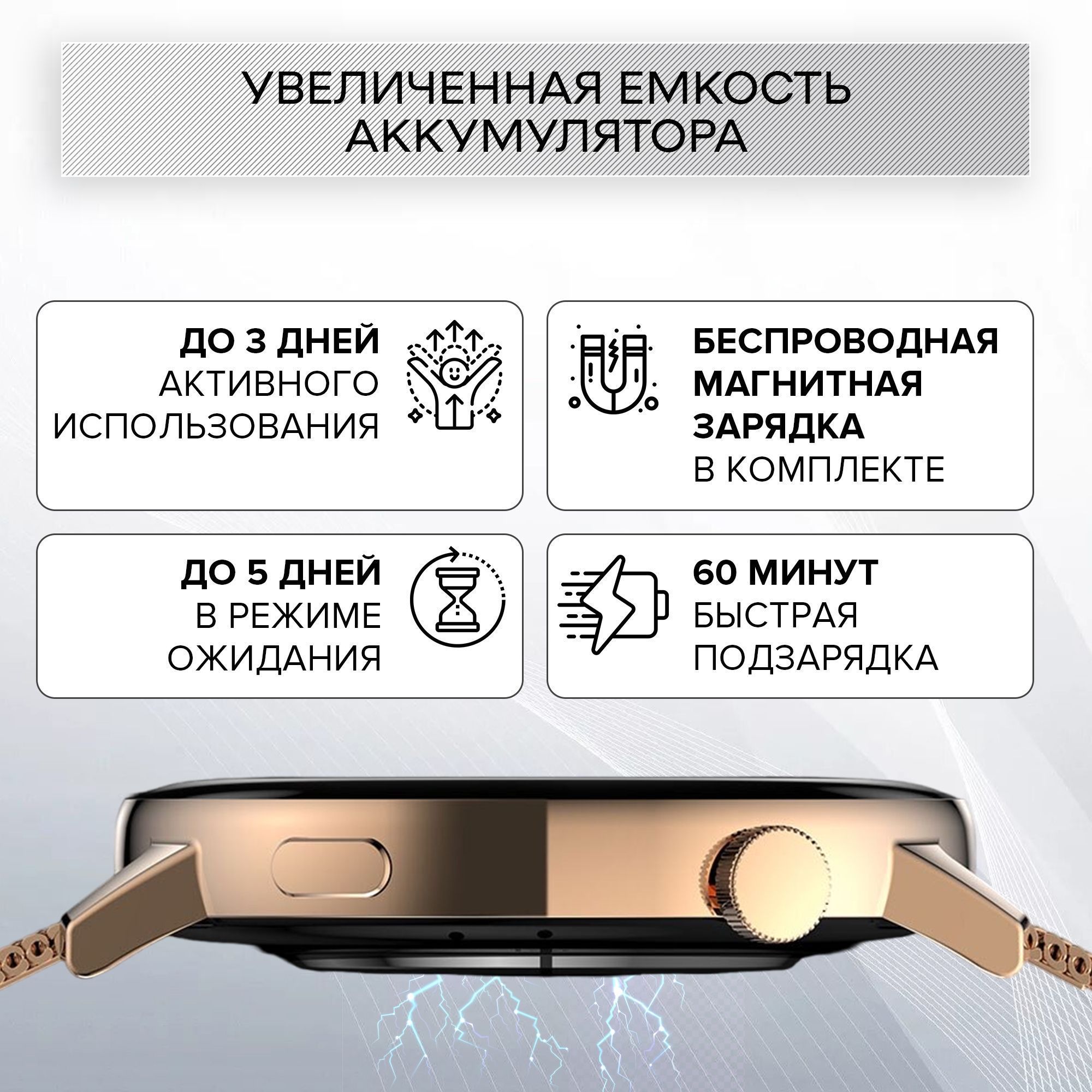 Дополнительно можно скачать множество бесплатных циферблатов на любой вкус. При этом вы всегда имеете возможность устанавливать свои картинки на главные обои смарт вотч через функцию "Пользовательский интерфейс"Быстрая зарядка, долгая работаЧасы электронные наручные оснащены аккумулятором с большой емкостью в 380 мАч и с низким уровнем энергозатрат. Часы без подзарядки работают до 4 дней активного использования всех функций. Быстрая зарядка за 60 минут восстановит полный заряд фитнес браслета.