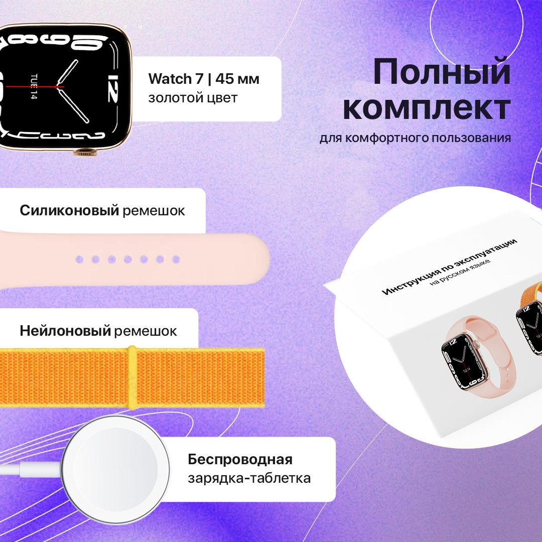 Влагозащита IP68часы умные 45 ммПолный комплектДва ремешка - силиконовый и нейлоновый, беспроводная зарядка, инструкция на русском языкесмарт часы 45 мм41 или 45 mmЗолотой корпус циферблата