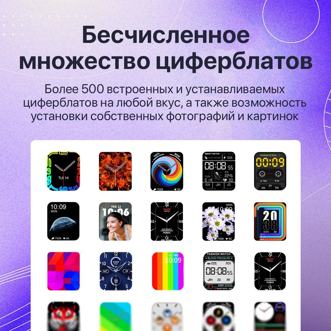 Контролируйте пульс при занятиях спортом. часы с мониторингом снаАНАЛИТИКА СНАКонтроль сердечного ритма и сатурации во время сна, фиксация стадий сна от быстрого до глубокого, позволяет оценить качество сна и автоматически подсчитывает время, проведенное в различных стадиях сна. Благодаря этой функции получить рекомендации о том, как улучшить качество своего сна.часы циферблатыБОЛЕЕ 500 ЦИФЕРБЛАТОВБолее 500 предустановленных циферблатов, возможность установки циферблата с собственным изображениемумные часы 7 ВИДОВ МЕНЮИзменяйте меню как вам удобно, все функции смарт-часов в одно касание на одном экране. Современный гаджет, который станет незаменимым помощником для ведения здорового образа жизни.