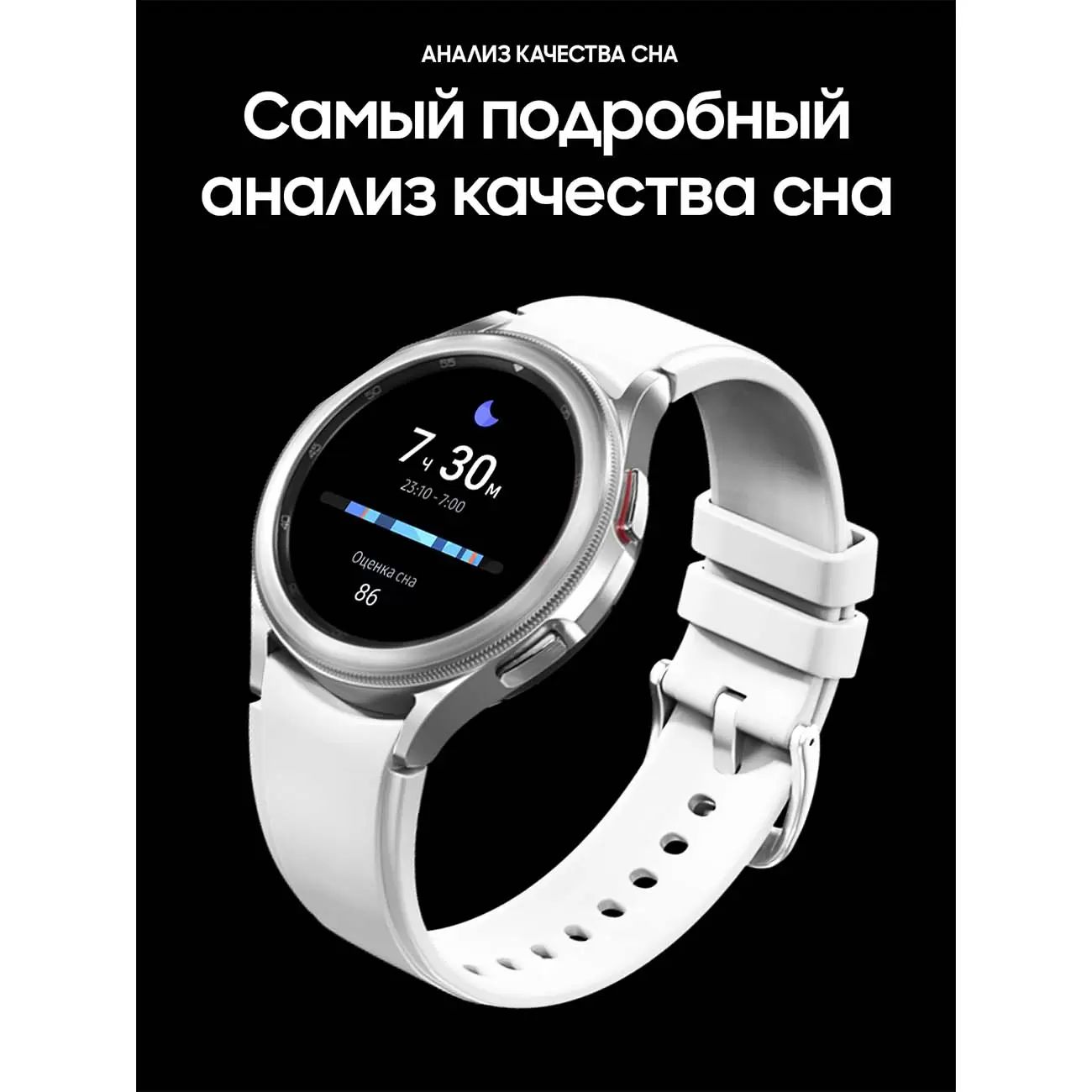 Все данные о состоянии вашего сердцаВстречайте новый датчик Samsung BioActive, который способен измерить ЭКГ и артериальное давление в режиме реального времени. После первоначальной калибровки датчик с лёгкостью определяет ваше артериальное давление. Вы также можете проверить наличие отклонений в частоте и ритме сердцебиения при помощи функции ЭКГ и сохранить данные на своём смартфоне.*Функции измерения ЭКГ и АД предназначены для пользователей, достигших 22 летнего возраста и старше. Пользователям младше 22 лет доступна только часть приложения Samsung Health Monitor. Чтобы ваши измерения артериального давления были точными, вам необходимо калибровать Galaxy Watch раз в месяц (каждые 28 дней) при помощи тонометра с манжетой. Для использования данного приложения требуется смартфон Galaxy с ОС Android 7.0 и новее.**Измерение артериального давления рекомендуется производить в состоянии покоя, как это делается с использованием тонометра с манжетой. Не рекомендуется измерять артериальное давление во время занятий спортом, курения или употребления напитков.***Доступность функции и приложения может отличаться в зависимости от региона, типа подключенного устройства, версии ПО и оператора сотовой связи.****Историю результатов измерения артериального давления можно отслеживать в приложении Samsung Health Monitor, установленном на смартфоне, при условии, что он сопряжён с Galaxy Watch4 Classic.Для измерения артериального давления используется оптический датчик сердечного ритма, более известный как PPG датчик. Запись ЭКГ происходит при помощи электродов.*Функции измерения ЭКГ и АД предназначены для пользователей, достигших 22 летнего возраста и старше. Пользователям младше 22 лет доступна только часть приложения Samsung Health Monitor. Чтобы ваши измерения артериального давления были точными, вам необходимо калибровать Galaxy Watch раз в месяц (каждые 28 дней) при помощи тонометра с манжетой. Для использования данного приложения требуется смартфон Galaxy с ОС Android 7.0 и новее.**Измерение артериального давления рекомендуется производить в состоянии покоя, как это делается с использованием тонометра с манжетой. Не рекомендуется измерять артериальное давление во время занятий спортом, курения или употребления напитков.***Доступность функции и приложения может отличаться в зависимости от региона, типа подключенного устройства, версии ПО и оператора сотовой связи.****Историю результатов измерения артериального давления можно отслеживать в приложении Samsung Health Monitor, установленном на смартфоне, при условии, что он сопряжён с Galaxy Watch4 Classic.Самый подробный анализ качества сна на Galaxy WatchСпециальный трекер фиксирует и детально анализирует фазы вашего сна. Улучшенный алгоритм измерения позволит вам проверить уровень кислорода в крови и характер храпа (если он у вас присутствует). Дополнительно вы получите подробные рекомендации от Национального фонда сна для улучшения его качества и продолжительности.*Функция определения Качества сна предназначена для использования при занятиях фитнесом и оценке общего физического состояния. Не предназначено для выявления, диагностики, лечения каких либо заболеваний.**Измерения предназначены только для вашего личного ознакомления. Пожалуйста, обратитесь за консультацией к квалифицированному медицинскому специалисту. Доступность функции может отличаться в зависимо