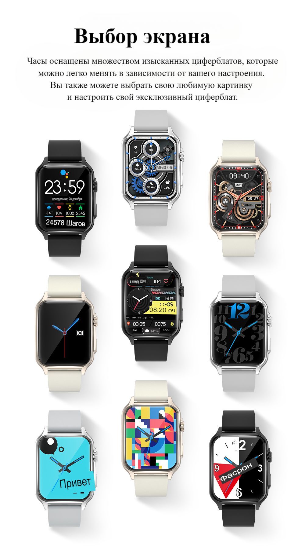 Встроенные датчики: Датчик артериального давления, Датчик уровня кислорода в крови, Пульсометр, Счетчик калорий, Тонометр, Шагомер, Датчик температуры тела, Термометр