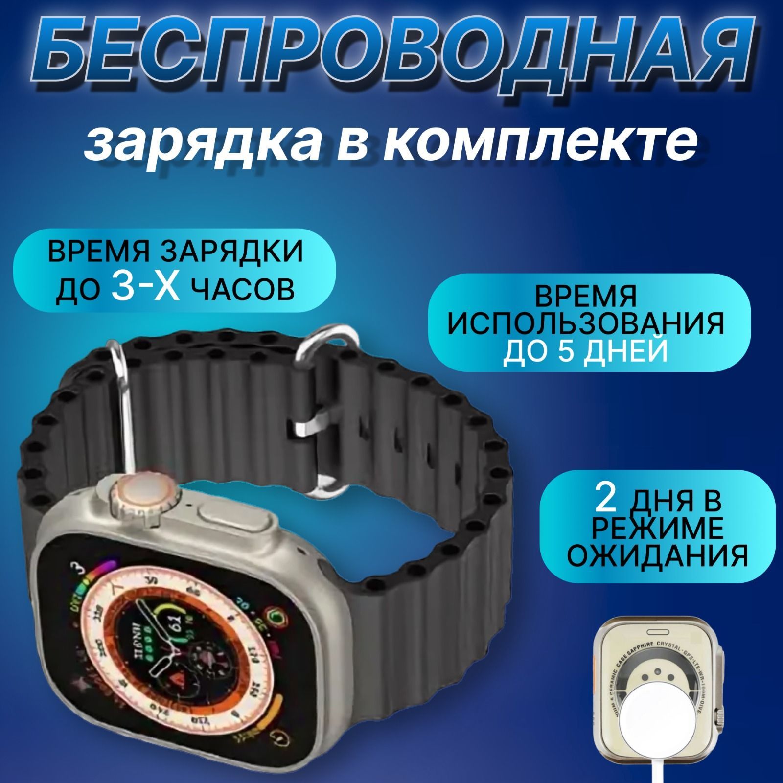 Смарт часы, силиконовый ремешок, зарядное беспроводное устройство, инструкция, коробка