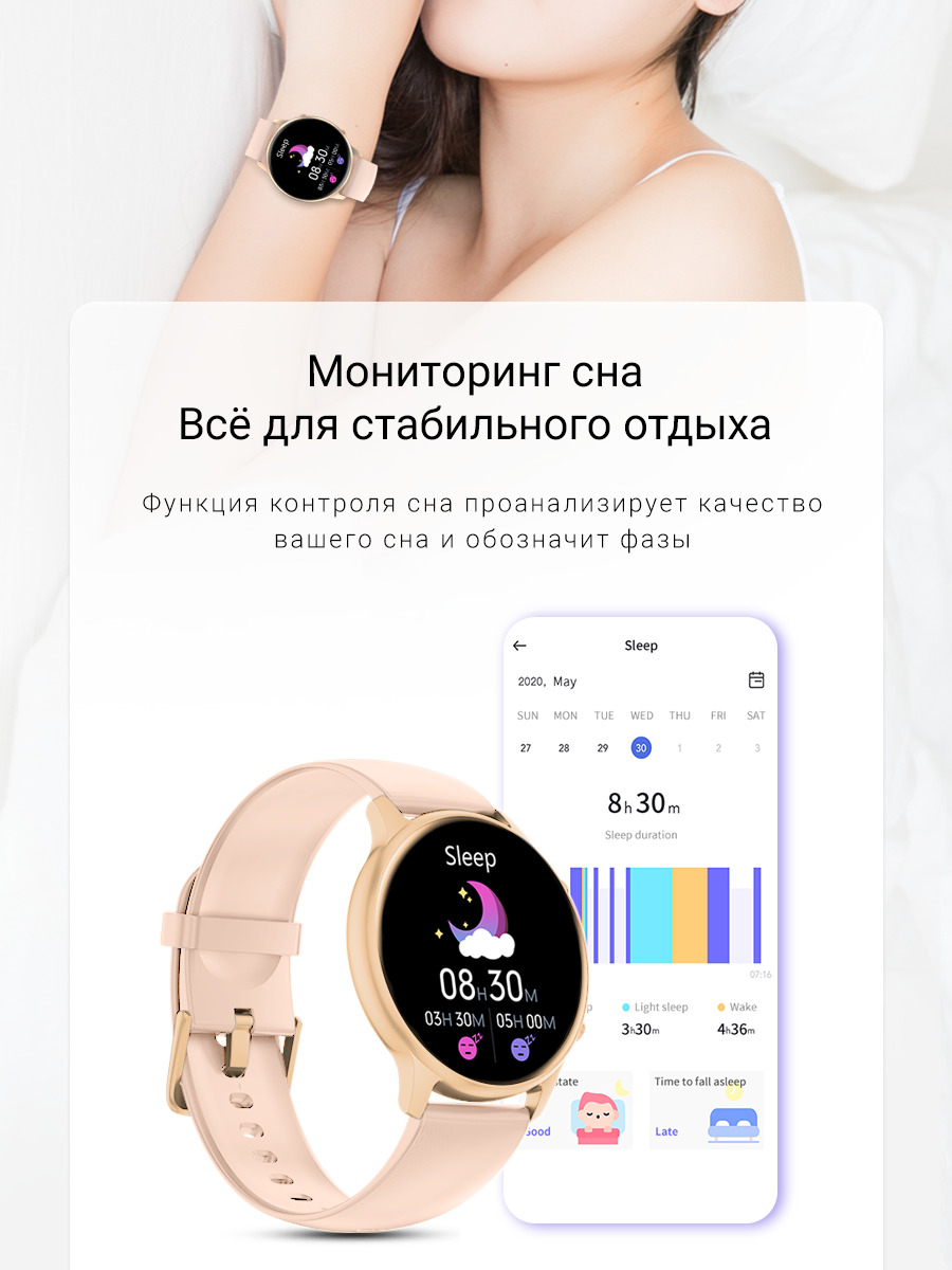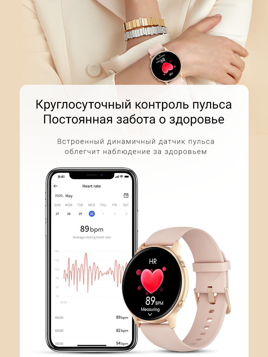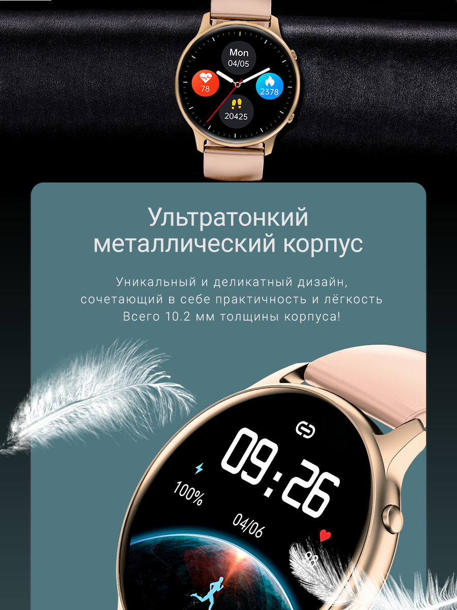 • Модель умных часов сочетает в себе уникальный и деликатный сочетающий в себе практичность и легкость. Всего 10.2 мм толщины корпуса.